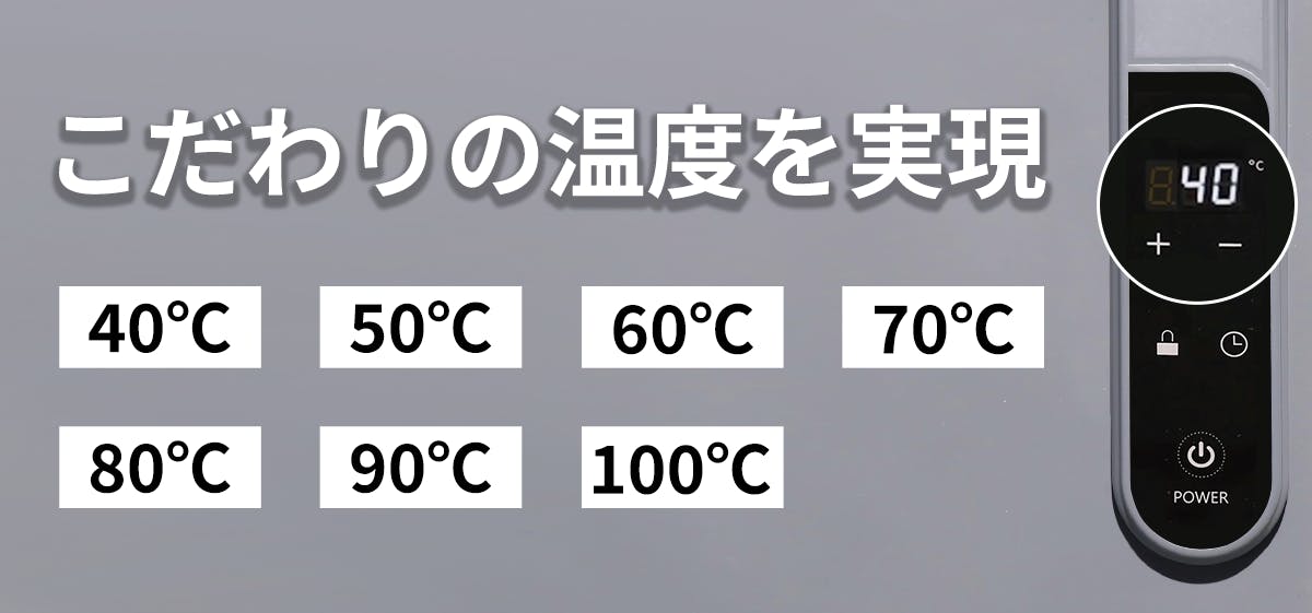 40℃の低温保温から100℃のしっかり加熱まで、7段階で細かく温度を選択可能。