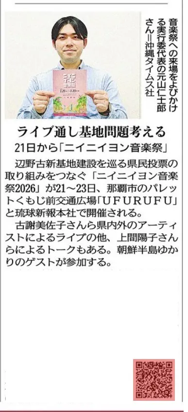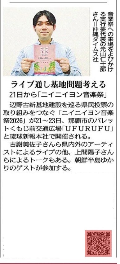 2026/02/24 19:08はいさい!実行委員会の元山仁士郎です。ニイニイヨン音楽祭2026は、昨日2月23日に無事に終了しました。お越しいただいた方々からは、ライブやトークの各出演者への賛辞はもちろん「これだけのものを入場無料はあり得ない…」「音楽もトークも楽しみました!」「続けてくれてありがとう」などなど、たくさんの嬉しい声をいただきました。どれもご支援いただいたみなさまのお陰です。本当にありがとうございます。クラウドファンディングは今日24日の23:59までとなります。ぜひあと1人、2人にでも、ご支援を呼びかけていただけますと幸いです。下記、現時点でのメディア報道まとめをお送りします(2/24 19:00時点)。==========「【2.24音楽祭】音楽と対話を通して沖縄の未来を考える トークセッションに玉城知事が登壇」(沖縄テレビ、2026年2月24日)https://www.fnn.jp/articles/-/1006141「『県民投票』から7年 知事らトークセッション」(琉球朝日放送、2026年2月24日)https://www.qab.co.jp/news/20260224284781.html「音楽やトークで平和考える 那覇でニイニイヨン音楽祭、23日まで」(琉球新報、2026年2月21日)https://ryukyushimpo.jp/national/entry-5058977.html「「南北分断伝える歌」 「イムジン河」那覇であす披露 日本語歌詞作成の松山さん」(沖縄タイムス、2026年2月21日)https://www.okinawatimes.co.jp/articles/-/1779628「「県民投票」忘れない 21~23日にイベント 古謝美佐子さん、上間陽子さんら多数登壇」(琉球新報、2026年2月20日)http://ryukyushimpo.jp/national/entry-5051868.html==========以上です。お時間あるときにご覧ください。よろしくお願いいたします。2.24音楽祭実行委員会代表 元山仁士郎 もっと見る【音楽祭最終日!】(クラファンは明日2/24まで)