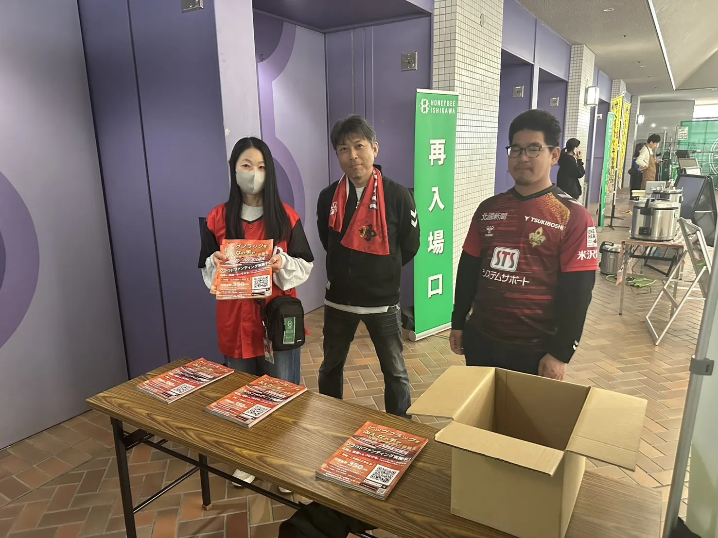 2026/03/31 15:003月29日(日)金沢市総合体育館2025-26 リーグH レギュラーシーズン女子第16節ハニービー石川 vs ザ・テラスホテルズ ラティーダ琉球の試合会場にて、クラウドファンディングPRのチラシ配りをさせていただきました。試合結果は29-21でハニービー石川の勝利!!以前ハニービーの選手がツエーゲンの試合にお越しいただいたご縁もあり、チラシ配りをさせていただける運びとなりました。石川ユナイテッドの繋がりに感謝し、石川のスポーツをみんなで盛り上げていきましょう!!急なお願いだったにもかかわらず、快く受け入れていただいたハニービー石川の関係者の皆様ありがとうございました。 もっと見る