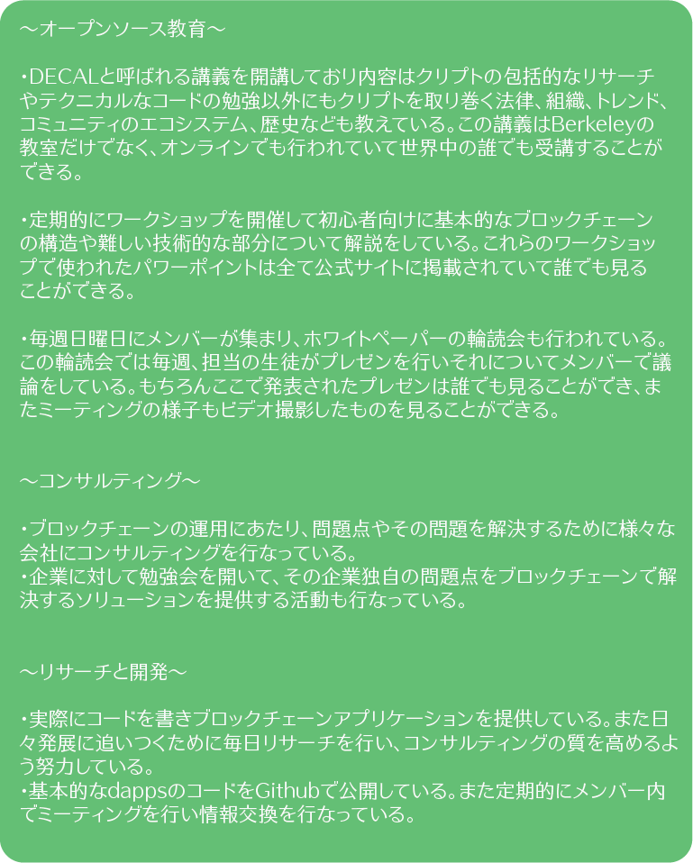 ・Blockchain at Berkeleyのようなレベルの高い学習環境を提供できる大きな規模のコミュニティを作りたい