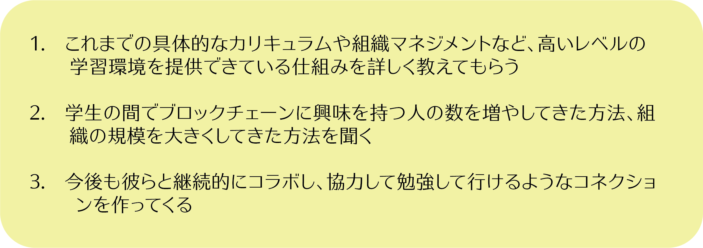 先ほど、メンターとなる技術者を見つけられていないという課題を抱えていると述べましたが、利益を追求する企業から学習リソースを求めるより、学生同士で高め合って行くことを目的としてパートナーシップを組む方が技術レベルを上げるという目的に対し有効な手段なのではないかと考えました。またBlockchain at Berkeley やCaltech Blockchain ClubはEthereum Foundationのコアリサーチャーと直接繋がり、タイミングが合えば直接勉強会にレクチャーしにきていただけるような関係性を築いています。そのような世界の中心であるコミュニティに私たちも一歩近づき、継続的に協力して勉強していけたら、と狙っています。
