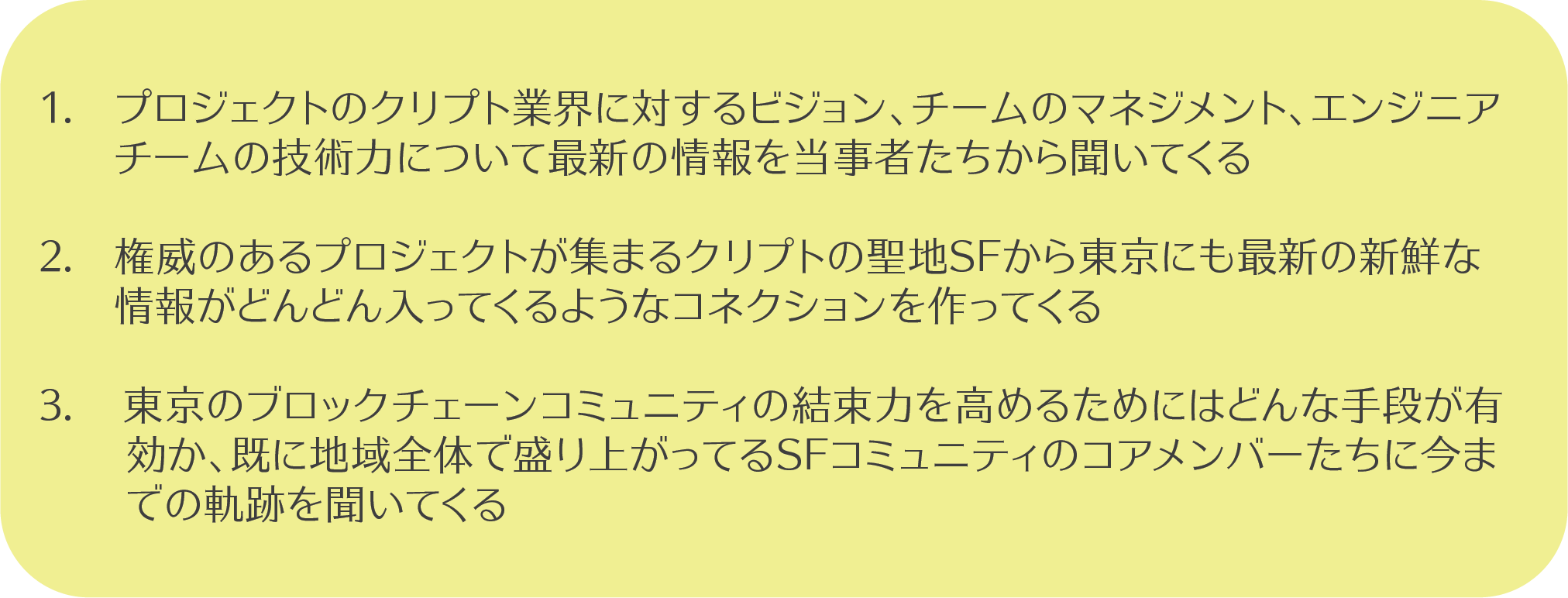 逆に私たちが世界をリードするブロックチェーン最先端の国になるにはどうしたらいいのか?今回はそのような課題を追求するため、今ならまだ遅れを取り戻して逆転できる、そんなタイミングである今すぐに、自ら視察へ行くことが必要不可欠であると思います。