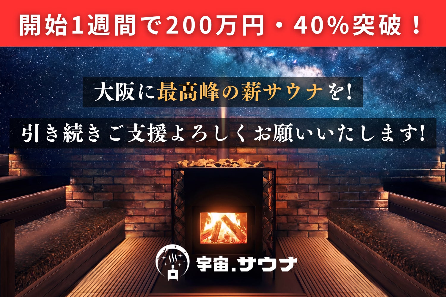 2026/03/09 19:00皆様、こんにちは。宇宙.サウナ代表の中島日向です。3月1日にスタートした本プロジェクトですが、開始から1週間が経過し、現在【支援総額2,220,000円 / 達成率44% / 支援者数176名】という進捗を迎えることができました。ご支援いただいた皆様、そしてSNSなどで拡散にご協力いただいた皆様、本当にありがとうございます。毎日のように増えていく支援者の方のお名前や、温かい応援コメントを拝見するたびに、メンバー一同、大きな力をいただいています。現在、宇宙.サウナの工事も着々と進んでいます。図面だったものが、少しずつ本物の空間として立ち上がり始めました。今回このプロジェクトを立ち上げたのは、大阪に薪サウナ文化を広げたいという想いからです。大阪では初となる40人規模の薪サウナ室。薪の炎が生み出すやわらかくも力強い熱、パチパチと薪がはぜる音、木の香り。そのすべてが五感に届き、身体だけでなく心までゆるめてくれます。忙しい日々の中で、仕事や人間関係など、さまざまな悩みを抱えながら毎日を頑張っている人がたくさんいます。そんな人たちが、ここに来たときだけは日常の疲れや悩みを手放して、少しでも軽い気持ちで帰ってもらえる場所にしたい。それが、宇宙.サウナをつくる理由です。皆様からお預かりした大切な支援金は、施設の核となる「薪ストーブ」と「宇宙空間の演出」の導入コストとして、大切に活用させていただきます。SNSでも、サウナ室づくりの裏側やこだわりの設備の導入進捗などを、写真付きでお届けしています。少しずつ形になっていく宇宙.サウナの様子を、ぜひ一緒に見守っていただけたら嬉しいです。そして本プロジェクトですが、目標としている500万円の達成まで、まだまだ皆様のお力が必要な状況です。もしよろしければ、身近な方へのシェアやSNSでの発信など、引き続きお力添えいただけますと大変心強いです。大阪に薪サウナ文化を広げるこの挑戦を、ぜひ一緒に育てていただけたら嬉しいです。引き続き、応援のほどよろしくお願いいたします。宇宙.サウナ代表中島日向 もっと見る