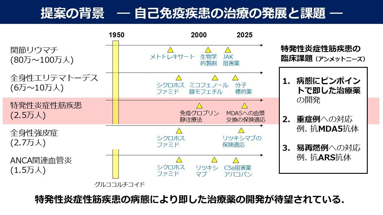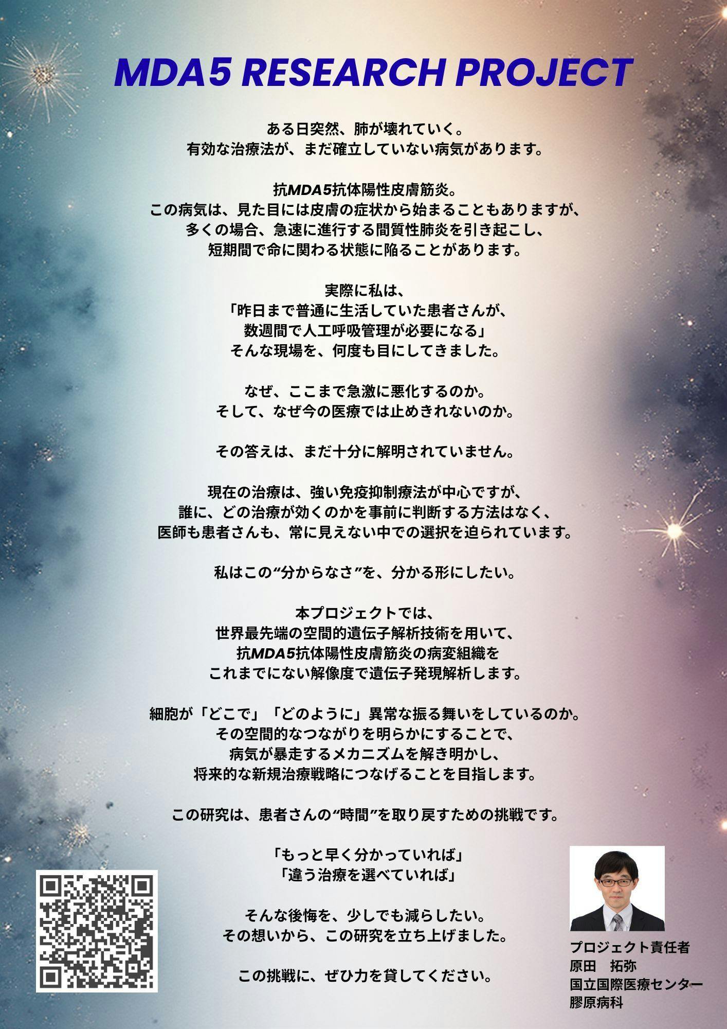 近年、抗MDA5抗体陽性皮膚筋炎・間質性肺炎のような難治性疾患の治療には、分子レベルでの病態解明が不可欠です。2025年の米国リウマチ学会では筋炎の一群である抗EJ抗体陽性筋炎の分子メカニズムについて報告を行いました。今回、筋炎の中でも最重症の抗MDA5抗体陽性皮膚筋炎に対して、貴重な病変組織をもとに、最新の高感度の遺伝子解析技術を活用して知見を得たいと考えております。しかし、これには多額の資金が必要であり、医療現場だけでは十分な資金調達が難しいのが現状です。そこで、皆様のご支援をいただき、この研究を前進させるためのクラウドファンディングを立ち上げました。