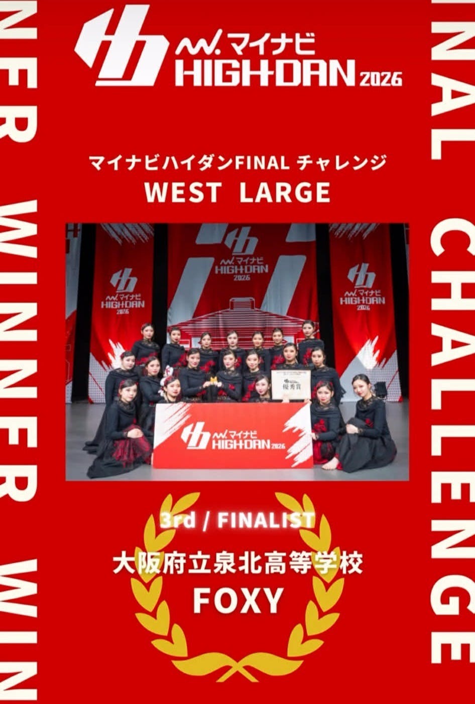 2026/02/25 15:10マイナビHIGHDAN2026 WEST vol.3に出場しました。優秀賞という結果をいただくことが出来ました!体調不良などで練習に全員が揃うことは少なく、時間も限られており、不安がある中で当日を迎えることになりました。その中で、このような賞をいただくことができ、嬉しく思います。当日は全国大会に進むことができない結果となってしまいましたが、オンライン予選という形で再び挑戦する機会を頂いたので、絶対に結果を残してずっと目指してきた両国国技館で踊れるように頑張ります。今までの悔しさをバネに、最後のチャンスを掴み取れるようチーム一丸となって練習に励みます。審査をしてくださったJUDGEの皆様、関係者の方々、ありがとうございました!いつも応援してくださる皆様の支えがあり、優秀賞という結果をいただくことが出来ました!本当にありがとうございます!!これからも応援よろしくお願いします。#ハイダン #マイナビ #泉北高校ダンス部 #foxy#ダンス部【シェア歓迎|ご協力のお願い】このプロジェクトは、より多くの方に知っていただくことが、応援につながります。もしよろしければ、ご支援はもちろん!本活動報告やプロジェクトページのURLをご家族・ご友人・SNSなどで「お気に入り登録」「シェア」「いいね」「コメント」いただけると嬉しいです。一つひとつの応援が、私たちの大きな力になっています。引き続き、応援よろしくお願いいたします。▼泉北高校ダンス部 FOXY 公式インスタグラムはこちら▼クラウドファンディングページはこちらhttps://camp-fire.jp/projects/913124/view?utm_campaign=cp_po_share_c_msg_projects_show もっと見る