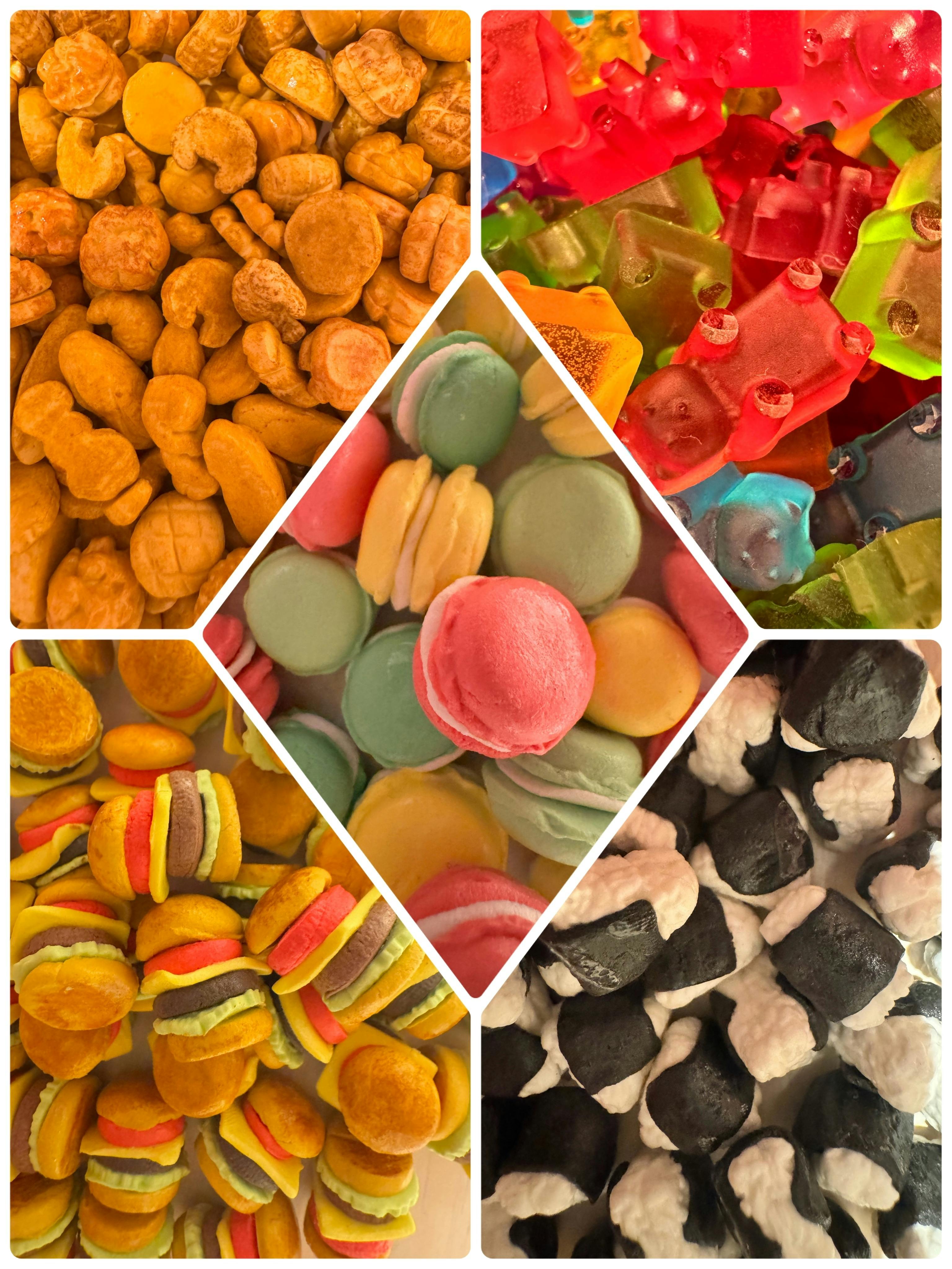 (左上:パン、右上:グミ、中央:マカロン、左下:ハンバーガー、右下:おにぎり)