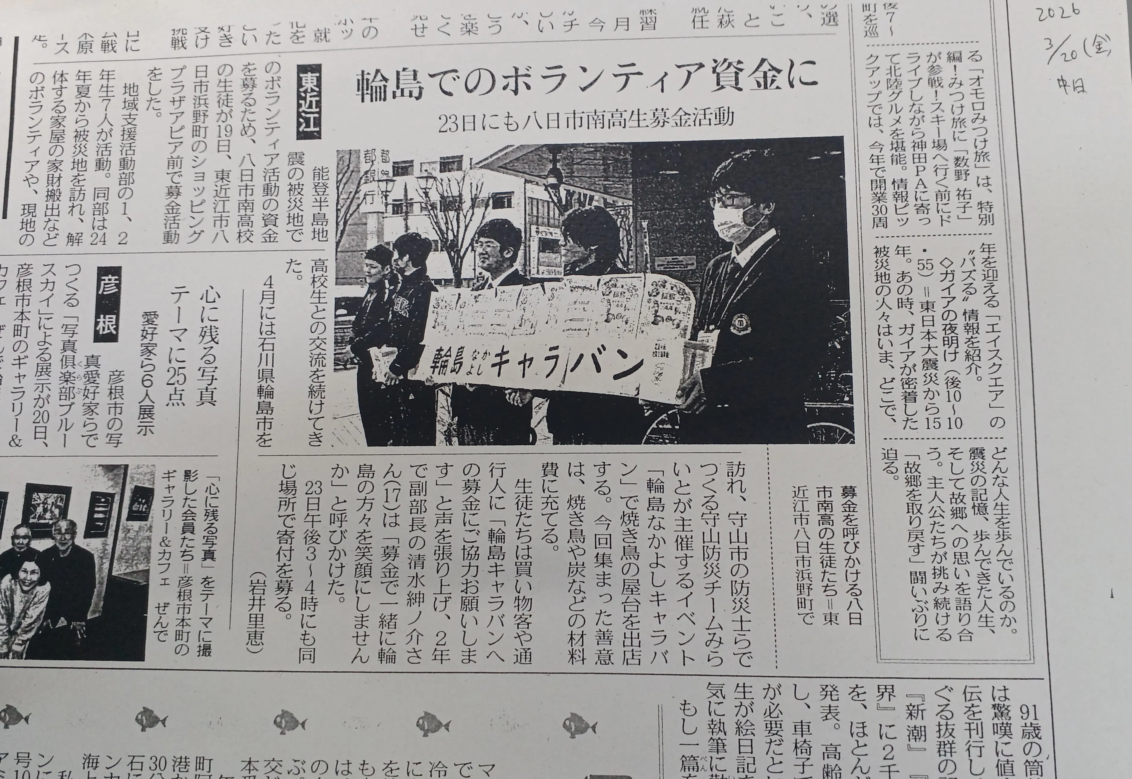 3/20(金)の中日新聞に、八日市南高校 地域支援活動部のメンバーが東近江市で募金活動に取り組んだ様子が掲載されました。