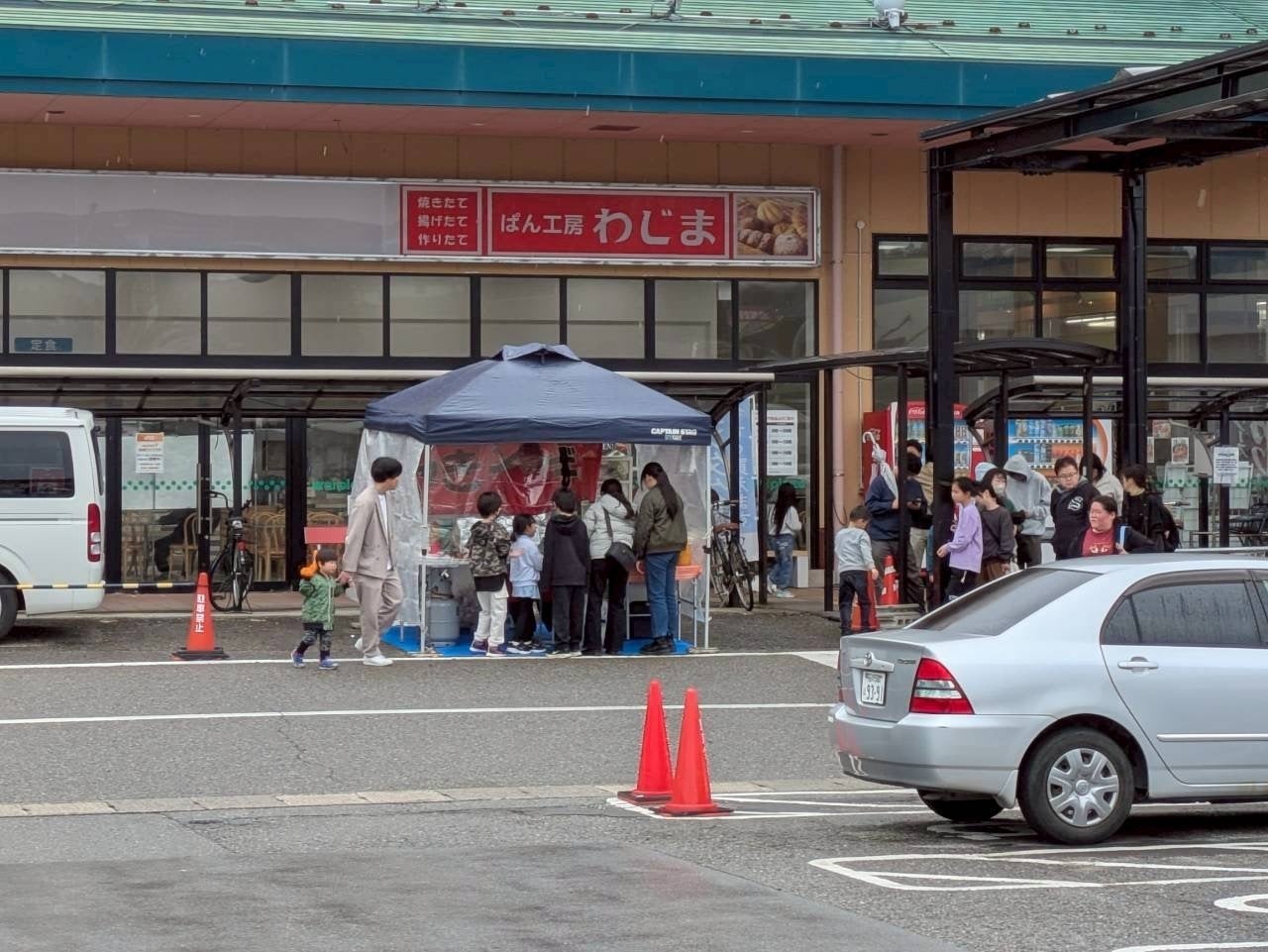 事前に輪島なかよしキャラバンのチラシを置いていただいていたところ、みっけちゃんとジェイキーとずぼらちゃんが到着したときに、ちょうどチラシを手に待っていてくれた家族もチラホラ。