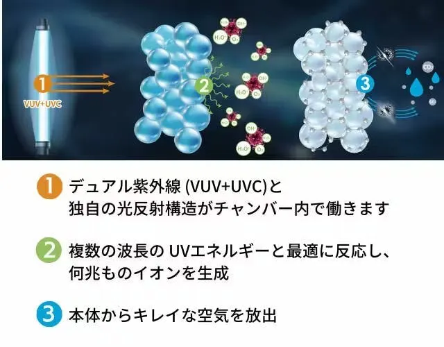 A:光触媒機能と除菌効果のあるUVを搭載しています。通常の使用で人体への影響はありません。