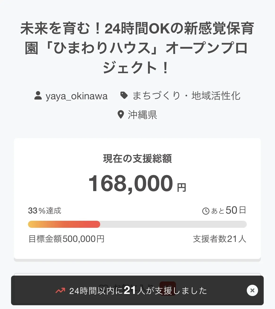 24時間以内に 21名の方からご支援をいただき、達成率33% に到達することができました。