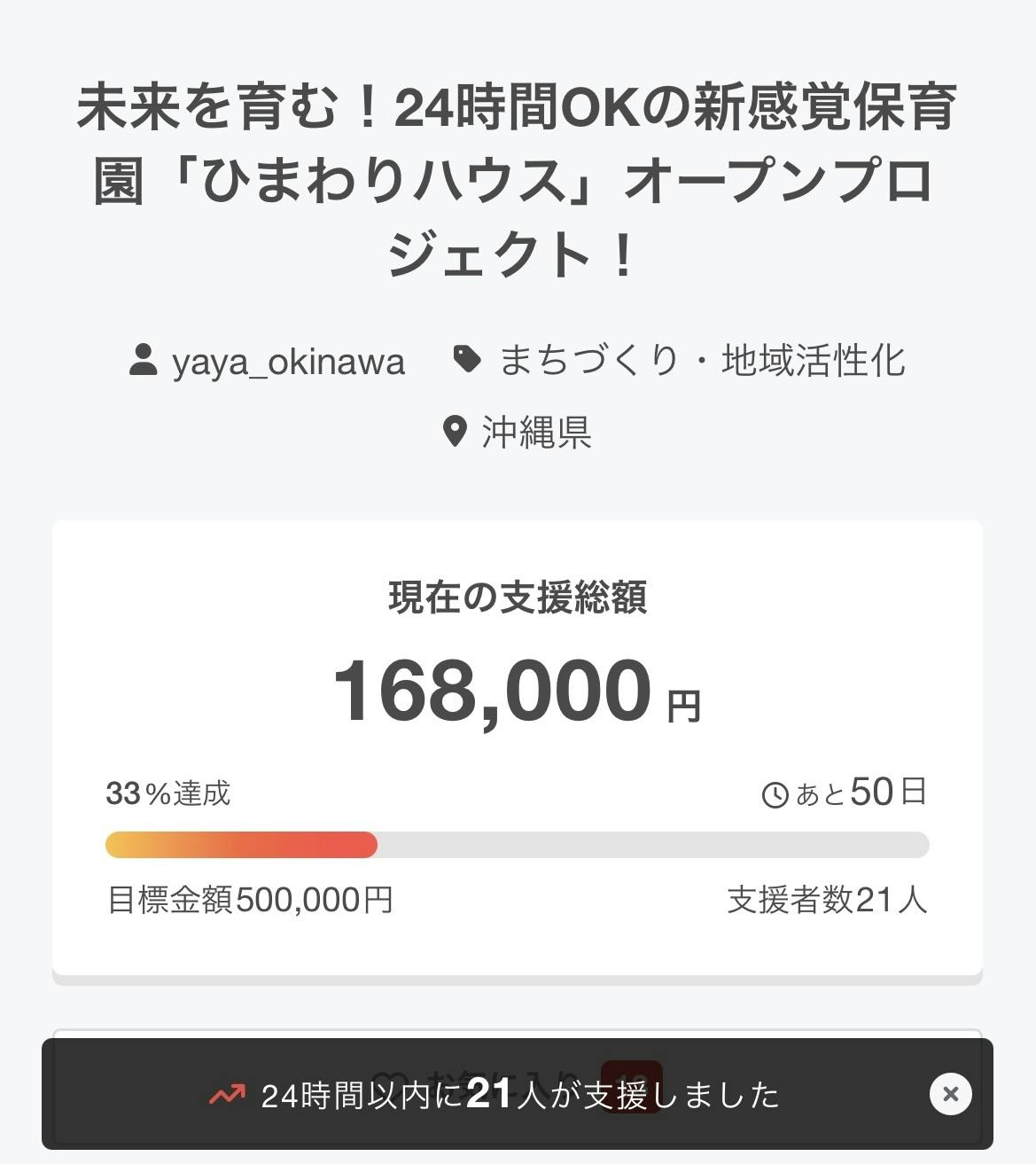 1/8のクラウドファンディング初日、そしてその翌日は、たくさんの発信をしたり、いろいろな方にご連絡したりと、正直クラファンのことで頭がいっぱいでした。現在、クラウドファンディングは残り45日、達成率42%。28名の方にご支援いただいています。ありがたいことに、まちづくり・地域活性化プロジェクトの注目のプロジェクトに選ばれました!!その一方で、資格の勉強や子どもの保育園のこと、事業の準備も同時に進んでおり、思うように発信ができない日もありました。同じように「沖縄北部の、まだまだ発展途上な地域にこそ24時間託児が必要だ」と感じてくださっている方が、こんなにもいらっしゃることを知ることができました。本当にありがとうございます。この挑戦は、まだ始まったばかりです。働く人にも、預ける人にも、そして何より子どもたちにとって、安心できる、あたたかい環境をつくるために。これからも、一つひとつ想いを込めて、発信を続けていきます。引き続き、応援よろしくお願いいたします。