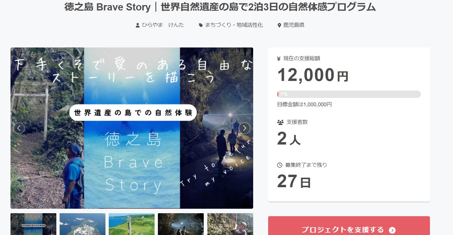 2026/03/15 17:40こんにちは!「徳之島 Brave Story」プロジェクトを応援してくださった皆さまへ、活動報告です。改めまして、この度は本プロジェクトにご支援いただき本当にありがとうございました。皆さまの温かい応援のおかげで、この挑戦を形にする第一歩を踏み出すことができました。キャンプファイアさんはじめ多くの人のお力をお借りさせて頂きましたありがとうございます!引き続いて、ご支援いただいた皆さまへのリターンについて、すべて完了いたしました。支援して頂いた方に直接手渡しさせていただきました!まだまだ未熟なこのビジネスを最初に応援してくれたことが、いつか誇りになるように、「徳之島ブレイブストーリー」を育成していきます!1年以内を目途により大きなリターンを返すことを目指しています。このプロジェクトに込めた想いこのプロジェクトは、そもそも社会人となった僕が社会のキツさの中で自身も見失い、適応障害になったところから這い上がった過程から着想を得ています。都会で忙しく自分を無視して過ごしていると、自分の感覚や本音を見失ってしまうことがあります。徳之島の自然は、そんな状態の人が「素の自分」に戻る力を持っている場所です。この場所で・自然を感じる・仲間と語る・自分と向き合うそんな人間らしいのにあまり触れれることがなくなった時間を復活させることが僕の使命です。これからについて今回のクラウドファンディングは一区切りとなりますが、「徳之島 Brave Story」の取り組みはこれからも続いていきます。むしろ、今回のクラウドファンディングは市場へ向けた「徳之島 Brave Story」の一発目の号砲です。ここから、Youtubeもはじめていきますし、企業向け、適応障害の方向け、学校にいけなくなってしまった子たち向けにこの体験はコミットしていき、確実な効果を得られるプログラムへと進化しだします!今後の活動についても、こちらでも共有させていただきます。引き続きよろしくお願いいたします。 もっと見る