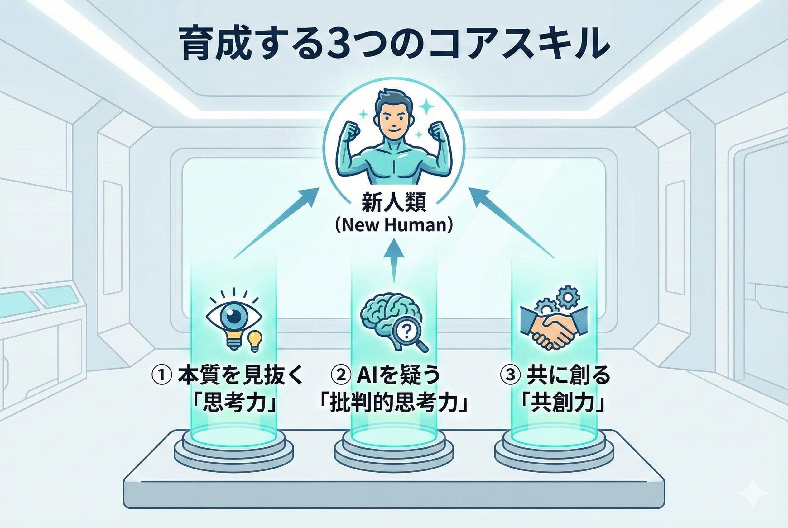 AIを単なる効率化の道具としてではなく、人間の創造性や思考力を拡張するパートナーとして捉え、「AIに依存せず、自律的に思考できる人財(=新人類)」を育成することを目的としています。