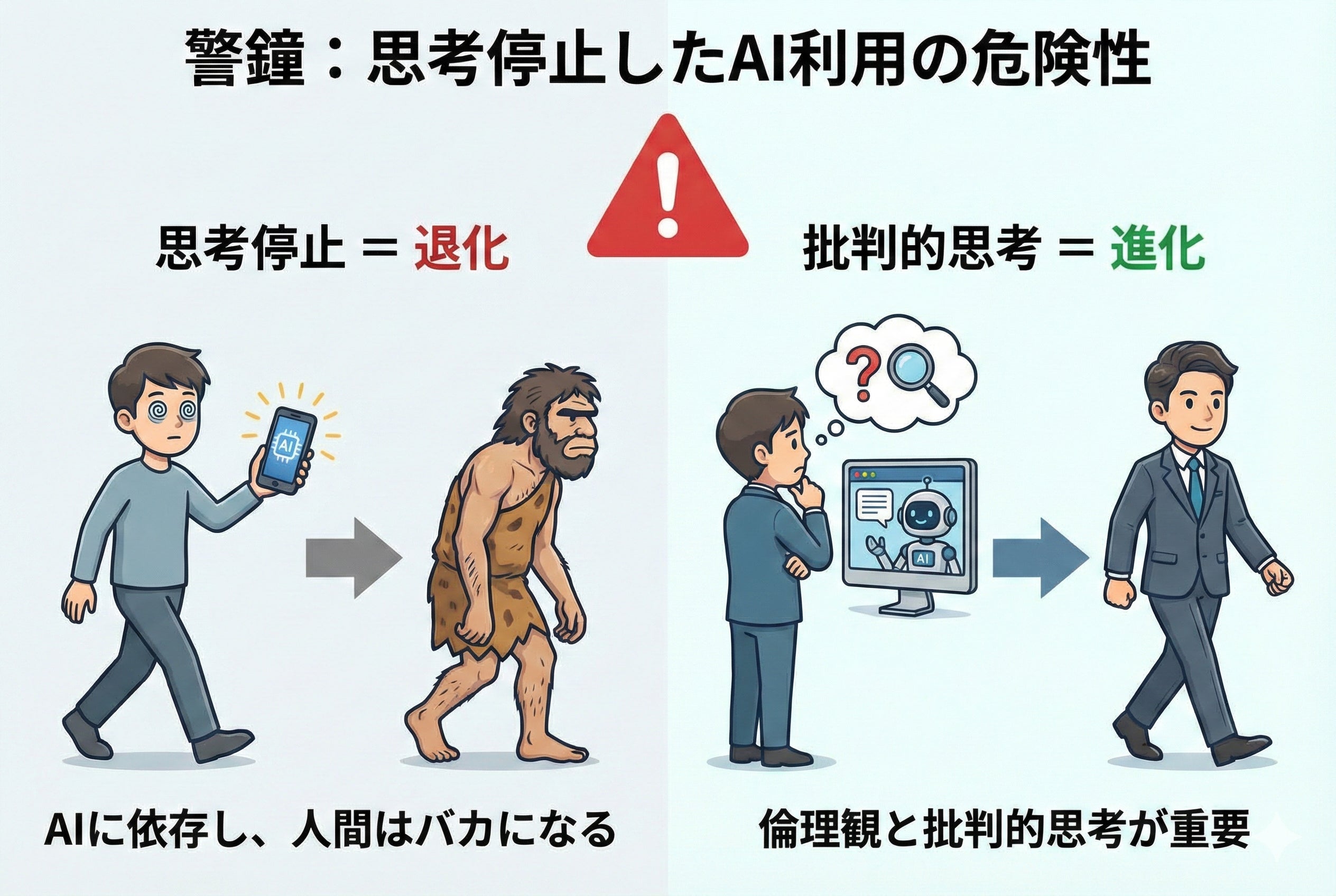 警鐘:「思考停止してAIを使うと、人間は退化する(バカになる)」という危機感を持ち、倫理観や批判的思考(クリティカルシンキング)の重要性を説いています。