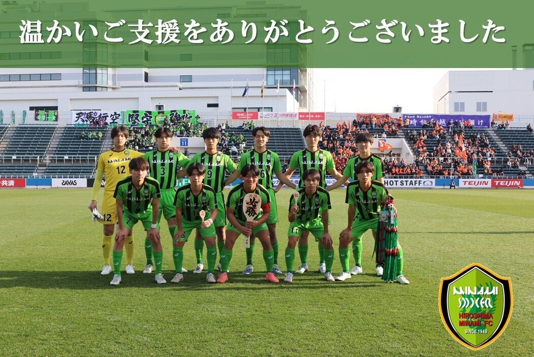 2026/01/01 11:53広島皆実高校サッカー部を応援してくださっている皆様へ昨日行われました全国高校サッカー選手権大会・2回戦の結果をご報告いたします。【試合結果】広島皆実 1 ー 3 水口結果は力及ばず2回戦敗退となりました。 目標としていた「日本一」には届きませんでしたが、全国各地から温かいご声援とご支援をくださったおかげで最後まで戦い抜くことができました。皆様方からご支援をいただきましたことあらためて御礼申し上げます。最後に、広島皆実高校サッカー部・上田貴典監督から皆様へ御礼をさせていただきます。「第104回全国高等学校サッカー選手権大会という夢の舞台に広島県代表としてチーム一丸で戦い、この度、広島皆実高校サッカー部は8大会振り18回目の出場を果たし、12年振りに初戦を突破することができました。勝利を掴み取ることができたのは、学校関係者、OB会や後援会の皆様、皆実高校のOB・OGの皆様、そして多くの広島皆実高校サッカー部を応援くださる皆様のおかげです。本当にありがとうございました。また、選手達は選手権という夢の舞台を「Team Minami」の代表として戦い、2回戦進出を果たしてくれました。新たなる広島皆実高校サッカー部の歴史を作ってくれた選手達には感謝しかありません。今大会を通じて得た経験と課題を新チームに還元していきたいと思います。そして、来年度も同じ舞台に戻ってこれるように選手達と共に頑張りますので、今後とも変わらぬご愛顧賜りますよう、よろしくお願い申し上げます。」 もっと見る