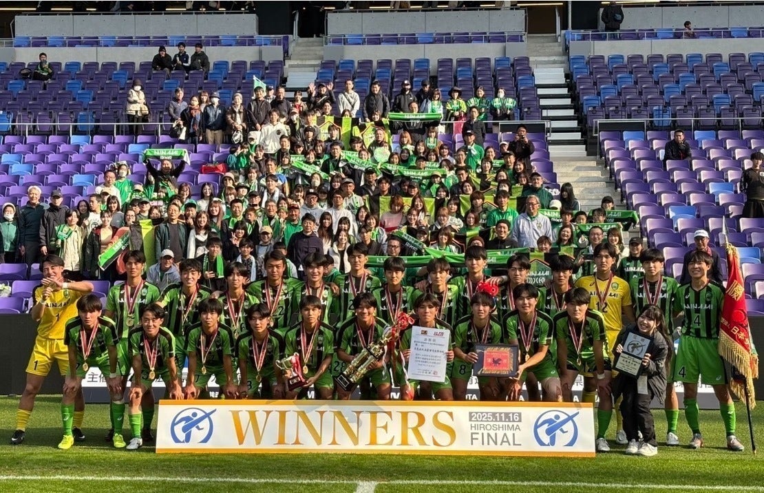 広島皆実高校サッカー部は、1949年に創部し今年総部76年目を迎え、全国高校サッカー選手権大会広島県大会では3年ぶり18回目の優勝を果たしました。この優勝の裏には、歴代の選手やマネージャー、身近で支えていただきながら悔しい思いをしてこられたOB会、後援会、保護者の皆様など多くの方の支えがあります。