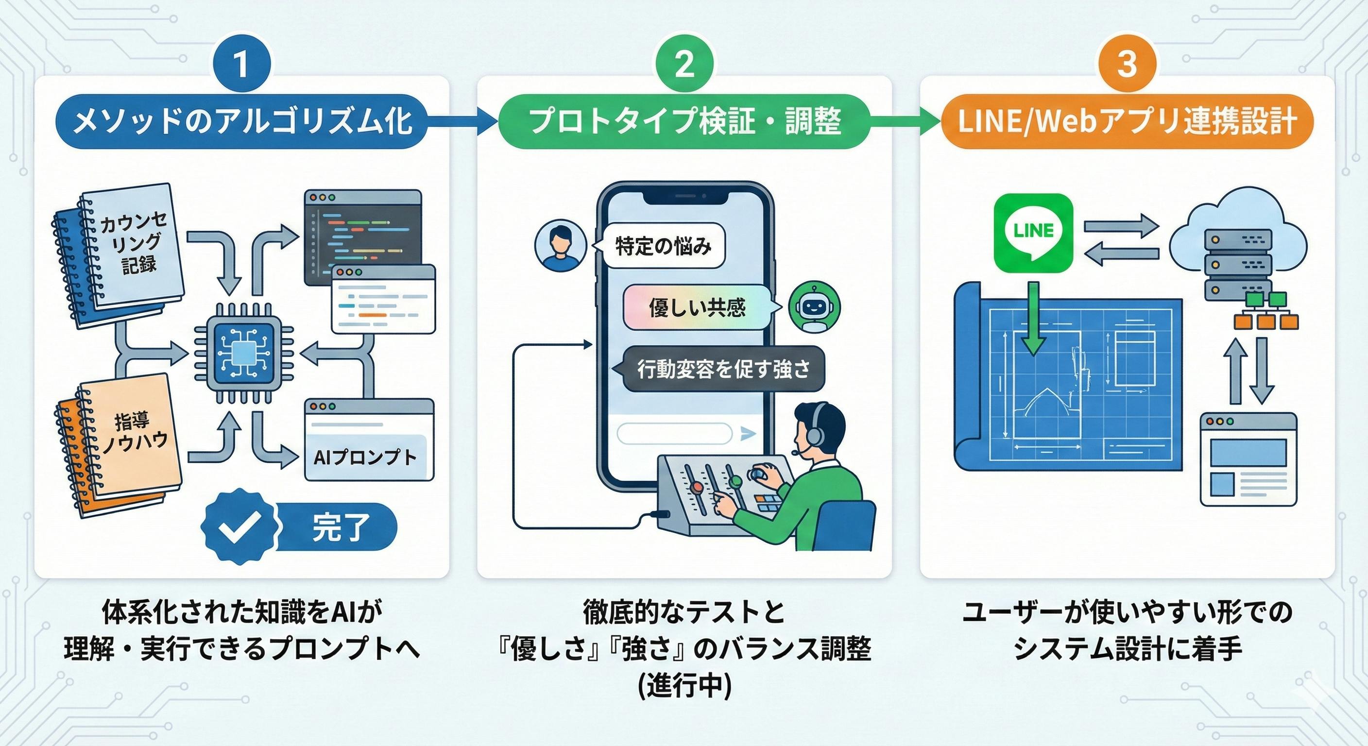 プロトタイプ(試作機)の検証:実際に特定の悩みに対してAIがどう返すか、私自身が徹底的にテストを行い、チューニングを重ねています。「ただ優しいだけのAI」にならないよう、必要な時には行動変容を促す「強さ」を持たせる調整を行っています。