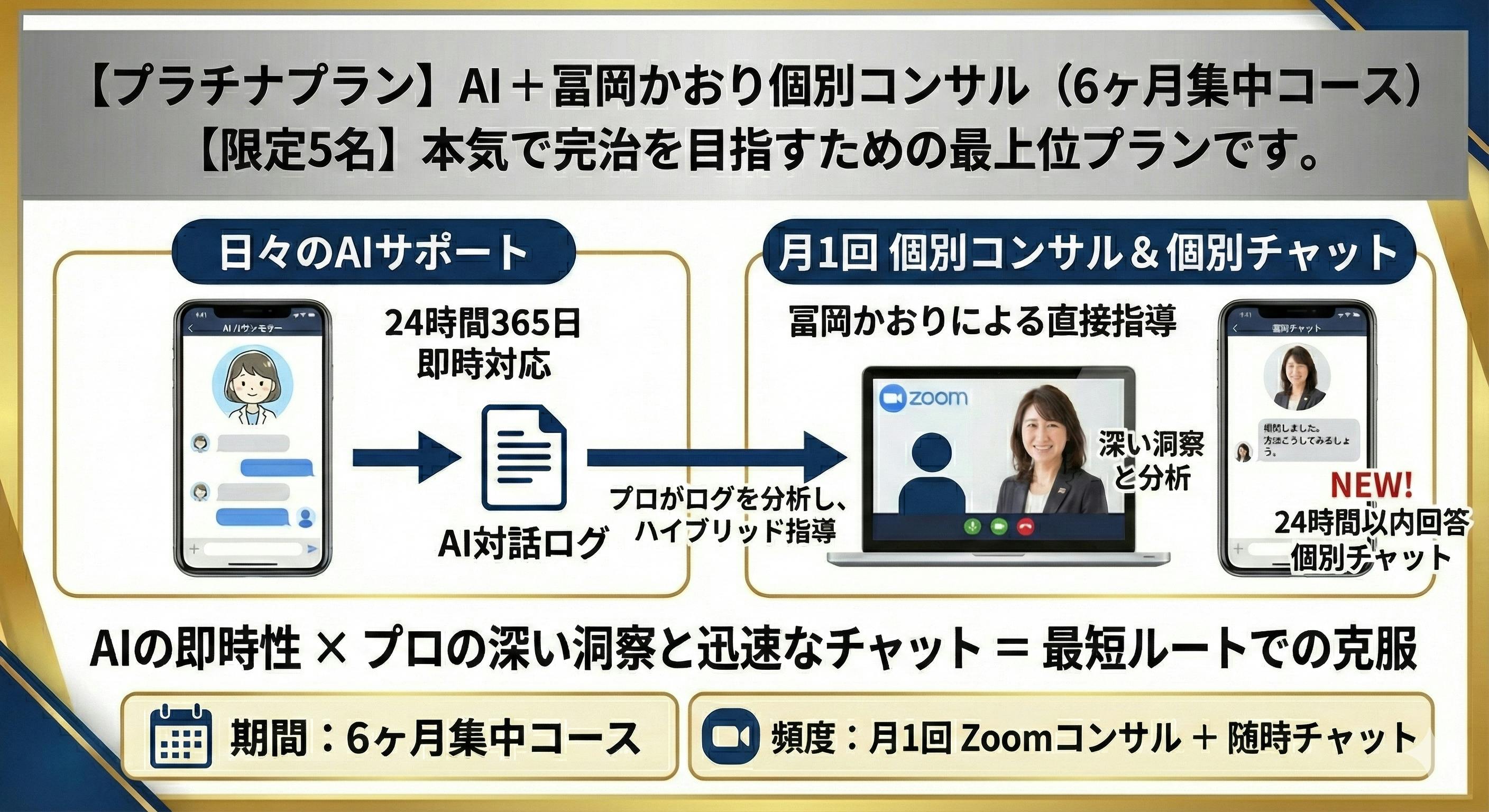 日々のサポートはAIが行い、月に1回(計6回)、私(冨岡)がAIの対話ログを分析した上で、Zoom等による直接カウンセリングを行います。