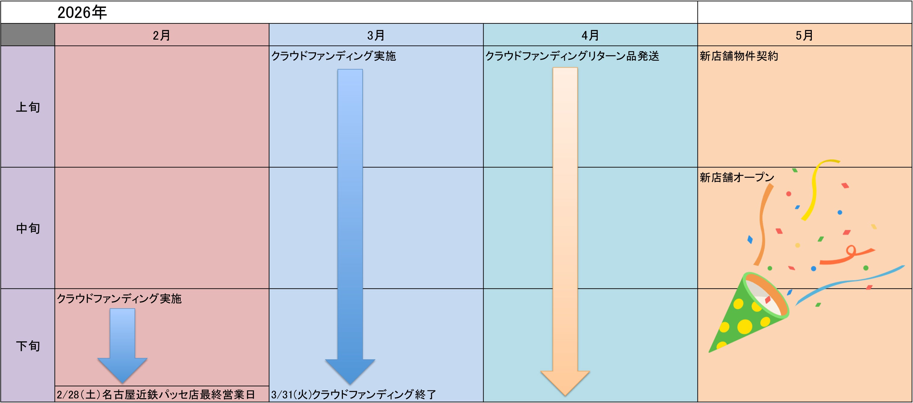 2026年2月末の名古屋近鉄パッセ店閉店、状況によりチャンスがあれば期間限定のPOP UP出店、3月末クラウドファンディング終了、4月リターン品発送、そして春頃の新店舗オープンを目指し、内装工事や商品仕入れを並行して進めてまいります。