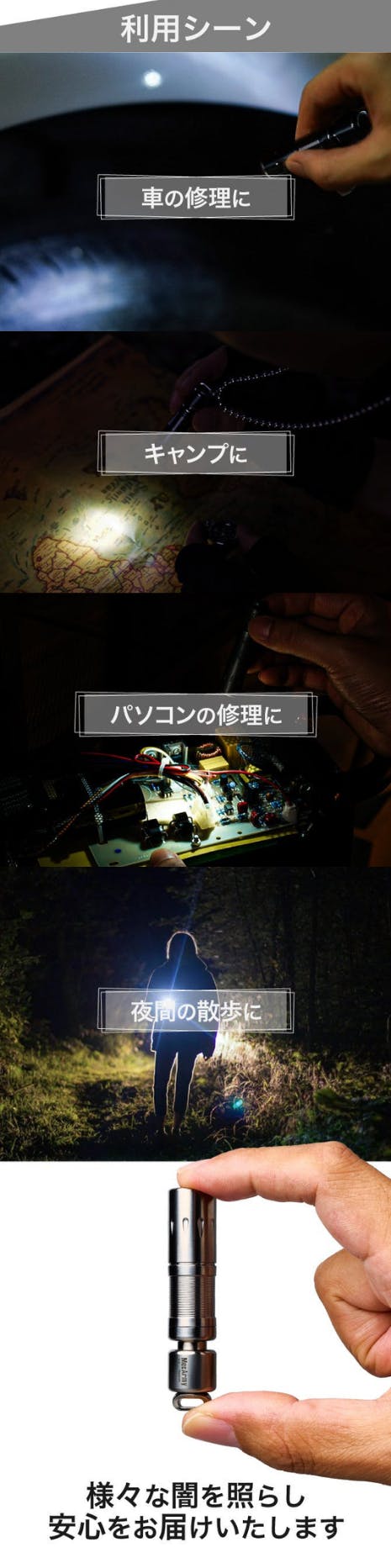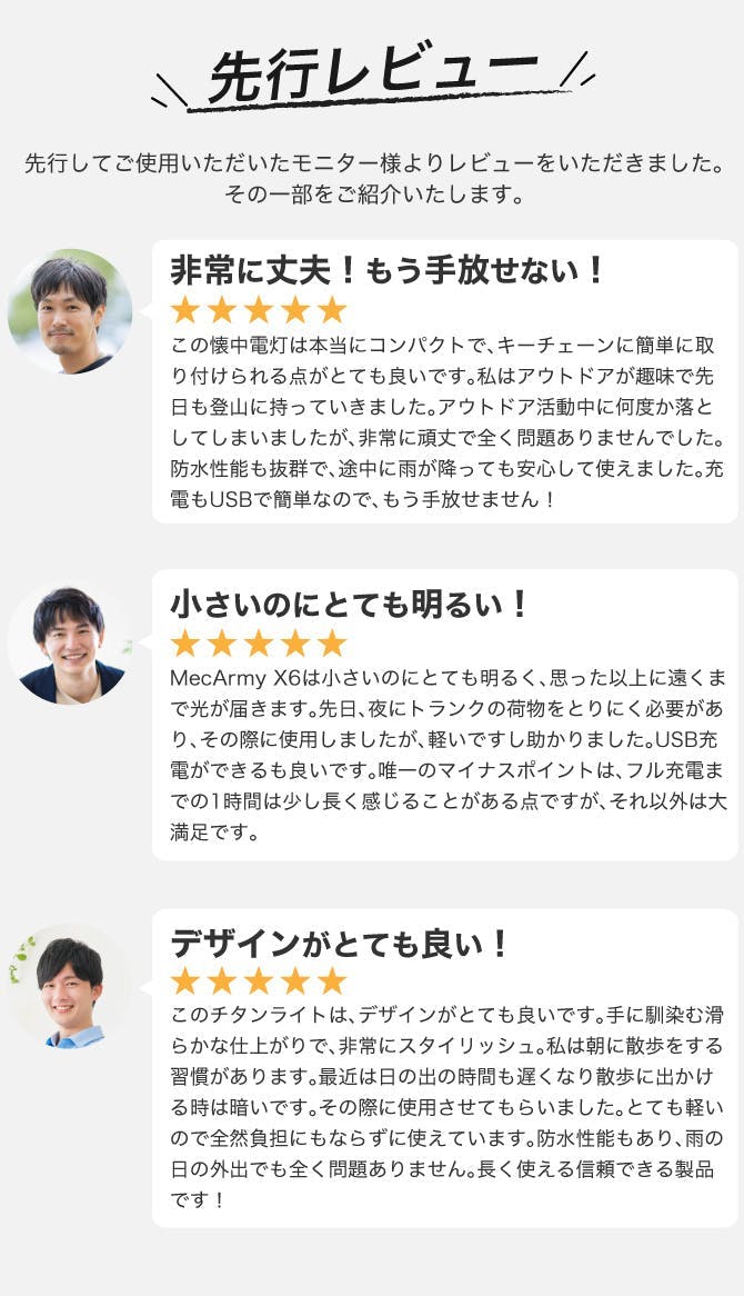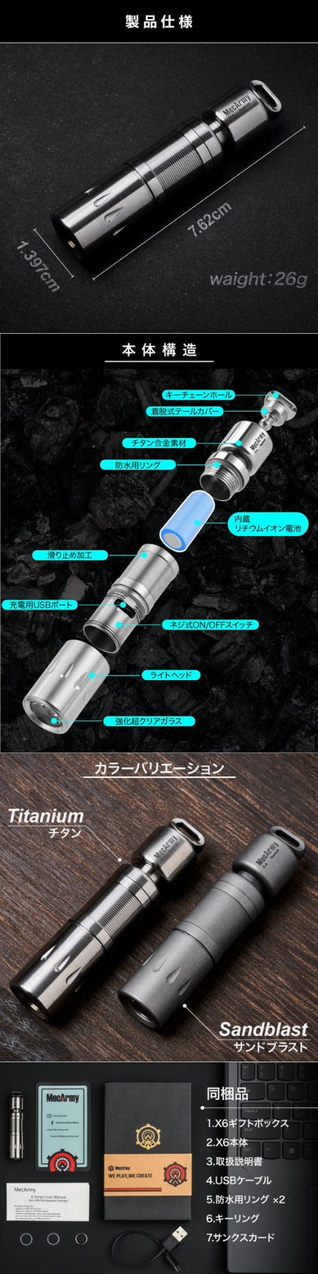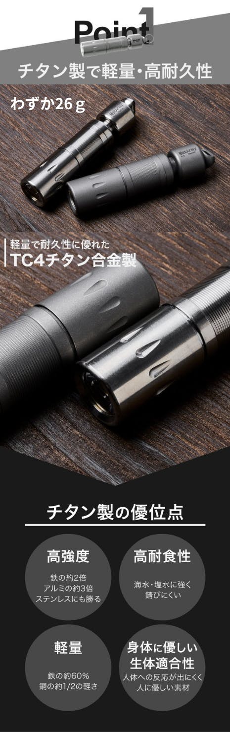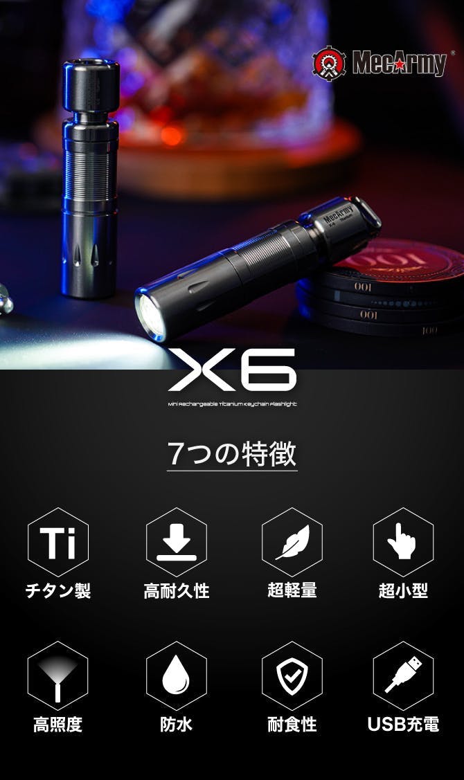 今回、私たちがご紹介するのは、MecArmyの高性能懐中電灯シリーズです。MecArmyは、耐久性・機能性に優れた懐中電灯メーカーとして知られており、世界中で多くのアウトドア愛好家やプロフェッショナルに愛用されています。特に、軽量で耐久性が高いTC4チタン合金を使用した懐中電灯は、アウトドア、DIY、日常生活での使用に最適です。