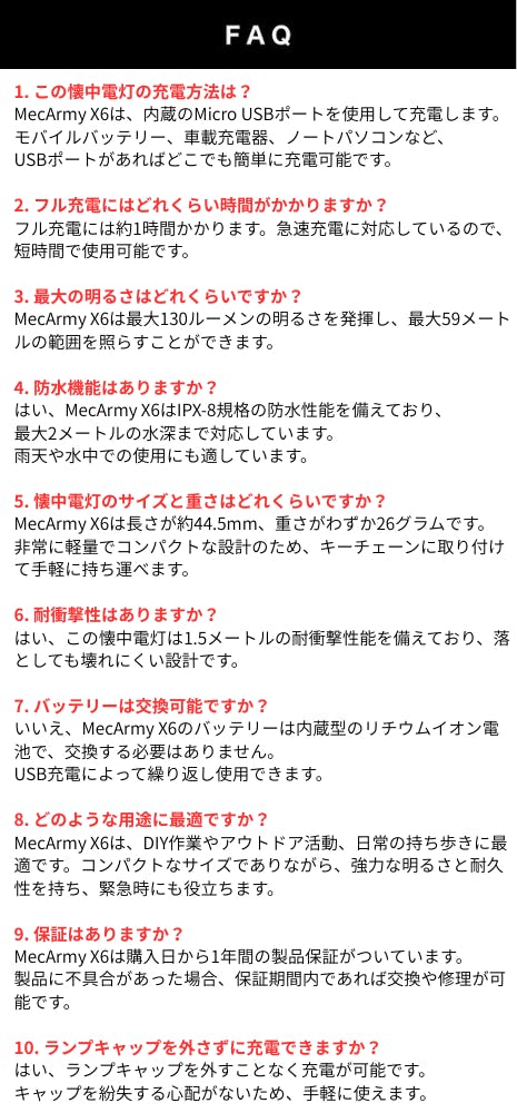 MecArmyは、アウトドア、キャンプ、DIY作業、警備業務など、多様なシーンで信頼されるツールを提供し、ユーザーの安全と利便性を向上させることを使命としています。防水・防塵、耐衝撃性に優れた製品が多く、過酷な環境下でもその性能を発揮します。