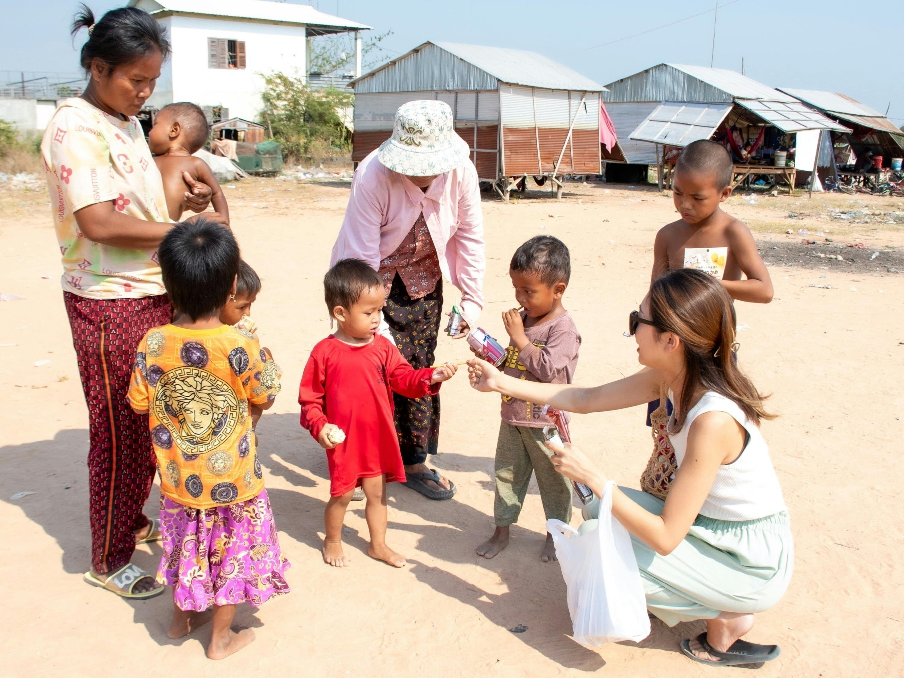 今回、このプロジェクトを立ち上げたきっかけについてお話しします。2年前カンボジアのアンコールワットがある街シェムリアップに行った時に出会った景色がこのプロジェクトのきっかけになりました。シェムリアップはカンボジアの中で第二の都市と言われております。しかし少し街を外れるとそこにはまだまだ大変な生活の風景が広がっていました。僕は旅先に行った際にはできるだけ現地の今を感じたいと思いながら旅をしています。その中で出会ったカンボジアの集落の人々と風景、そこで出会い、貧しい人たちの現状を感じることができました。この時僕らもジュースやお菓子や文房具などをプレゼントしてきました。子供たちは満面の笑顔で喜んでくれました。しかし実際に1番必要なのはお米や食料、ミルクやオムツなどが本当は1番必要なんだと集落で出会った方が教えてくれました。ジュースやお菓子は子供たちが虫歯になったりしてしまうから、嬉しいけど、できたらあげないで欲しい。文房具などももちろん役に立つものではあるが、まずは生きていく上での食料が1番必要なんだなと感じました。これも自分たちで現地を歩き話をしないとわからないことでした。日本から文房具等食料を持っていくにはコストもかかり持っていく量にも限界があります。やはり物価の安い現地でたくさんの人々に行き渡るようにと思い、正直、自分だけでは限界がありますので、少しでも共感していただいた方のお気持ちとともに、カンボジアの貧しい集落の人たちへ届けたいと思っております。