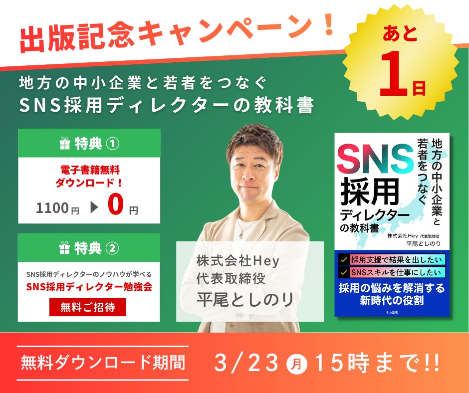 2026/03/20 19:02【感謝とご報告】Amazonランキング10部門で1位を獲得しました!ついに一昨日リリースした、電子書籍 地方の中小企業と若者をつなぐ『 SNS採用ディレクターの教科書』おかげさまで、Amazonの合計10部門でランキング1位を獲得することができました!応援してくださった皆さま、本当にありがとうございます。今、地方の中小企業が直面している「採用難」という壁。「いい人が来ない」「求人広告を出しても反応がない」「採用単価が上がり続けている……」そんな現場をたくさん見てきたからこそ、「動画とSNS、そして公式LINEを掛け合わせた新しい採用の仕組み」を世に広めたい。その一心でこの本を書き上げました。単にSNSを運用するだけでなく、・動画で企業の「本当の魅力」を可視化し・LINEで若者との「接点」を丁寧につくるこのメソッドで、採用単価を80%削減できる企業を全国に増やしたい。 今回のランキング1位という結果は、そんな「地方の未来を変える仕組み」への期待の表れだと、身が引き締まる思いです。現在、【出版記念キャンペーン】として無料ダウンロードを受け付けています。 経営者の方はもちろん、地域のために何か貢献したいと考えている方にも、ぜひ読んでいただきたい一冊です。この機会に、ぜひチェックしてみてください! もっと見る
