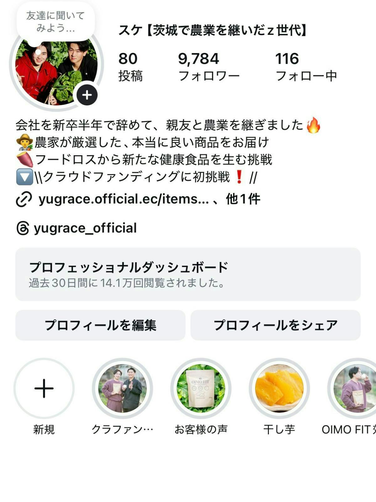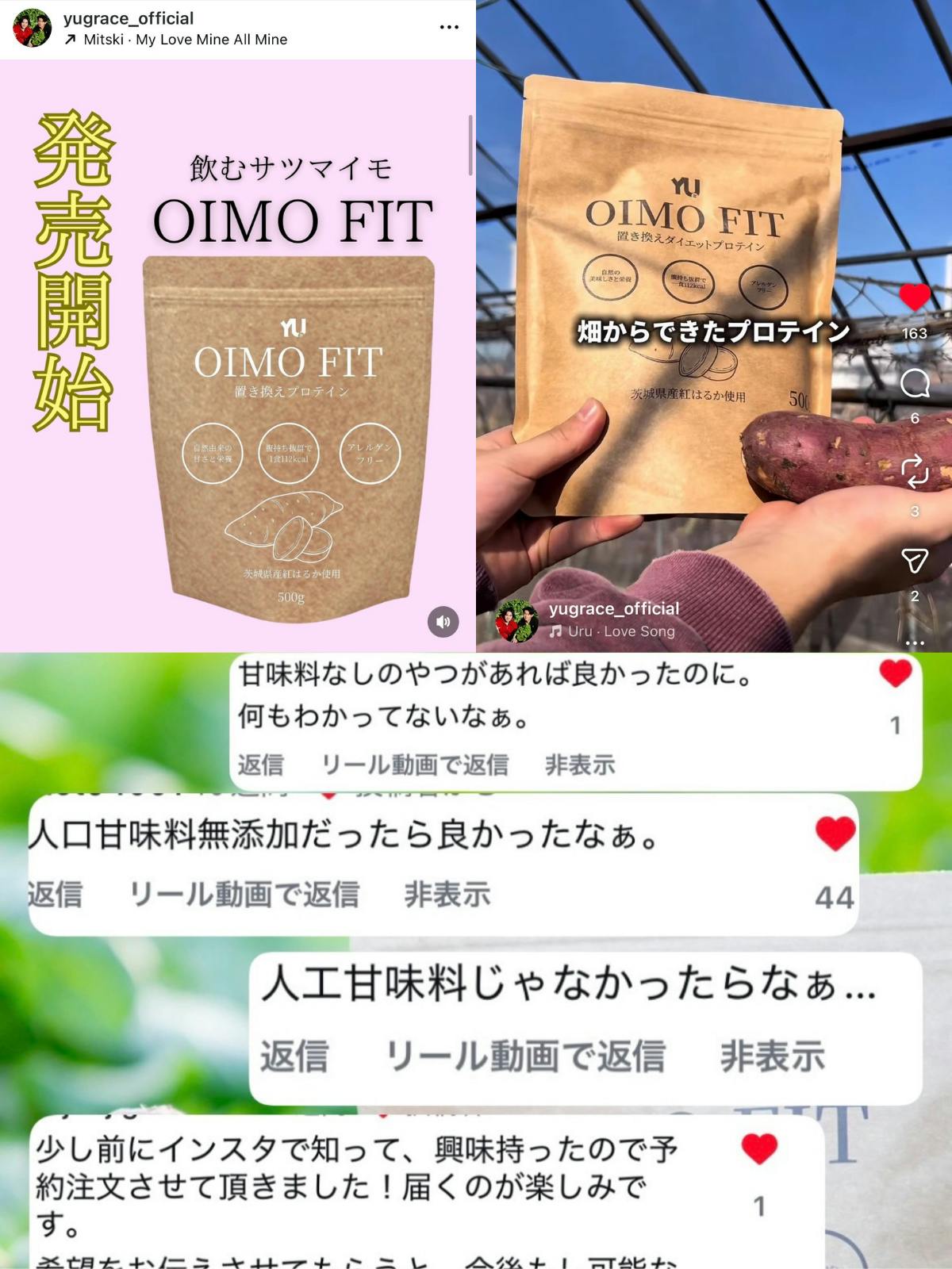 現在はInstagramフォロワー約1万人。広告費ゼロにもかかわらず、さつまいもプロテイン『Oimo Fit』は初月で約200件・売上100万円(税込)を達成し、返金は0件。提携農家3件とともに、初月だけで規格外・残さ約50kgの削減にもつながりました。