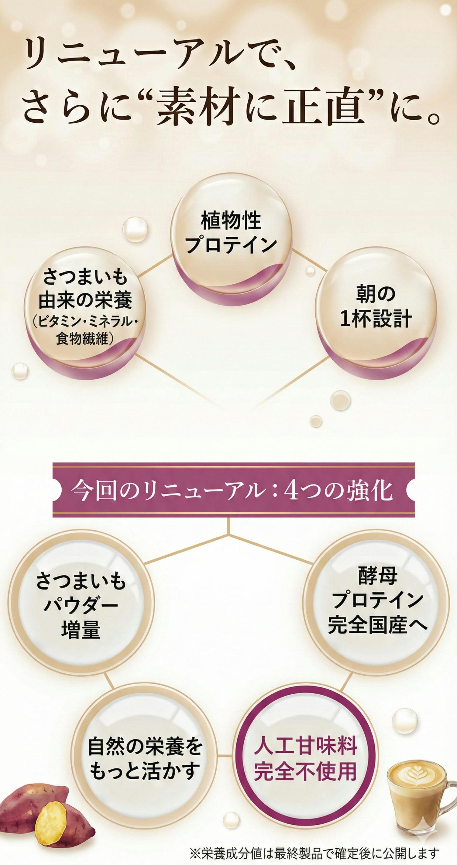 その想いを形にしたのが、今回リニューアルする『紅はるか腸活プロテイン(仮)』です。