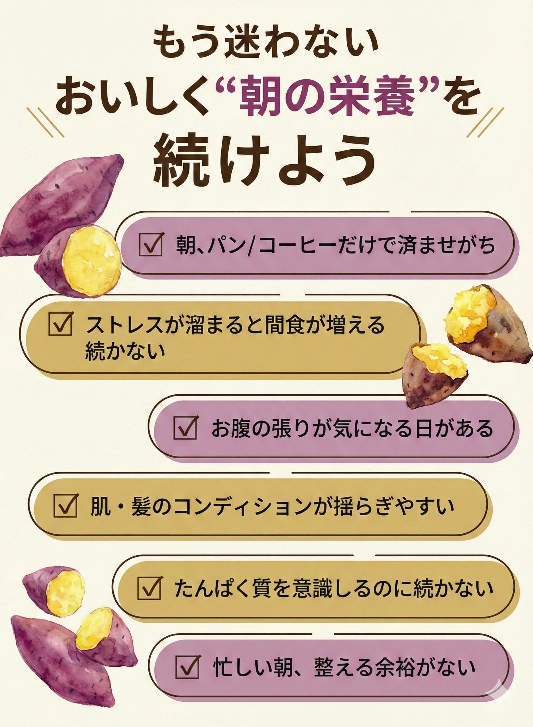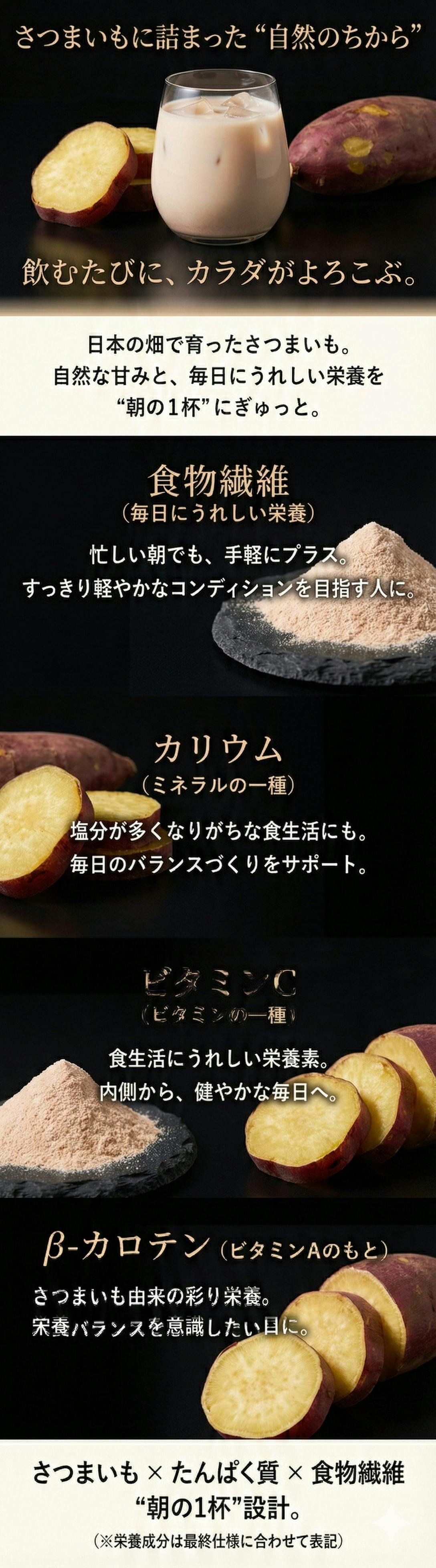 さらに、さつまいも由来の食物繊維・ビタミン・ミネラルも一緒に取り入れられる設計にしました。