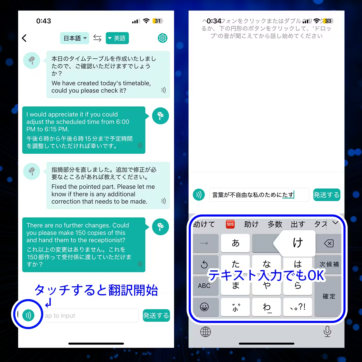 さらに、タッチ翻訳モードは近距離での会話に特に適しています。カフェやオフィス、商談の場などで、イヤホンを装着したまま片方が話し、もう片方がタップするだけで自然な会話が成立します。加えて、翻訳内容がテキストとして表示されるため、聴覚に不安のある方や高齢者の方でも視覚的に内容を理解できる点も大きな魅力です。短いフレーズのやり取りや細かな確認が必要な場面でも、効率的かつ正確なコミュニケーションをサポートします。特に正確さが求められる場面では、その使いやすさと信頼性が際立ちます。