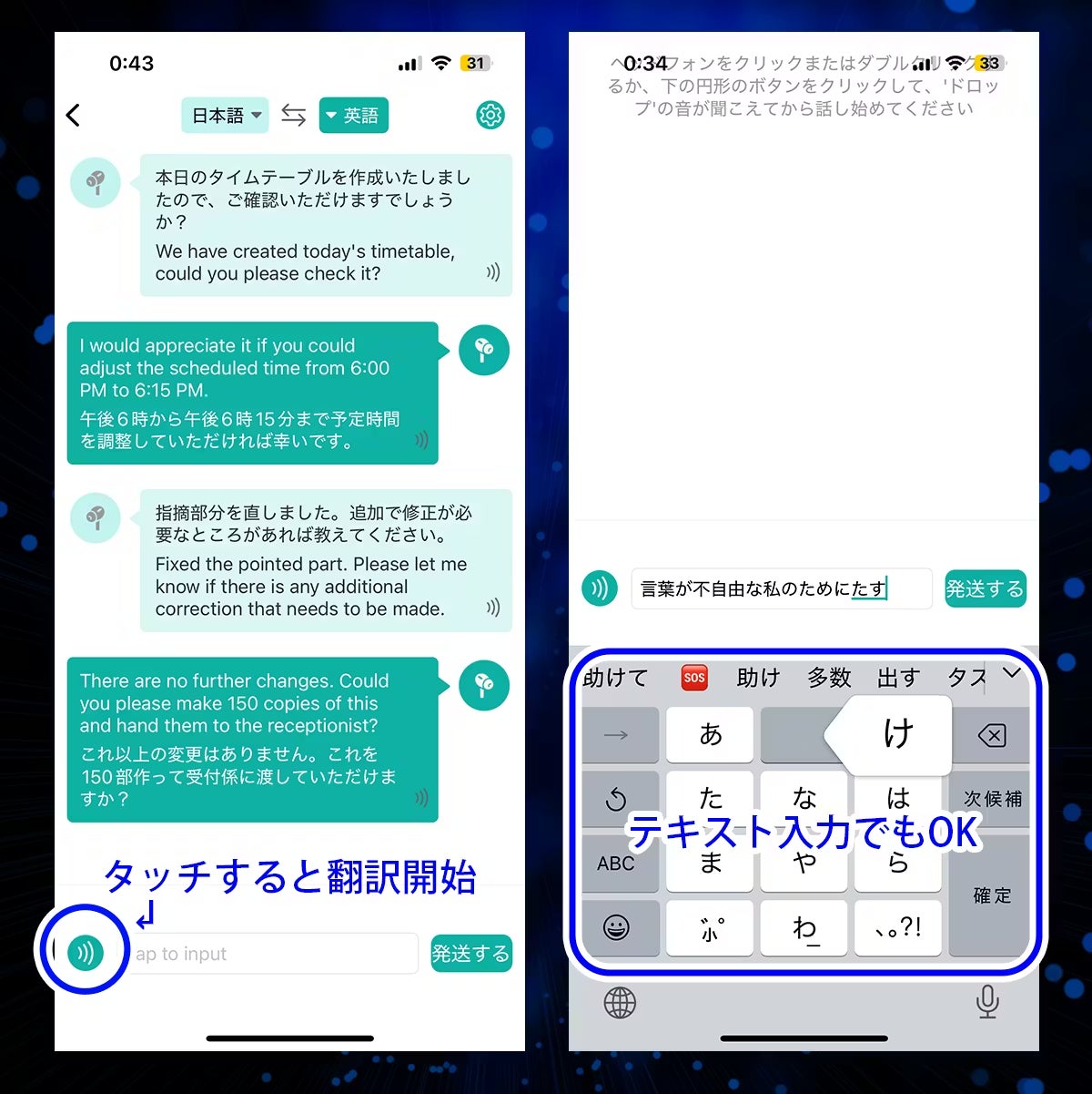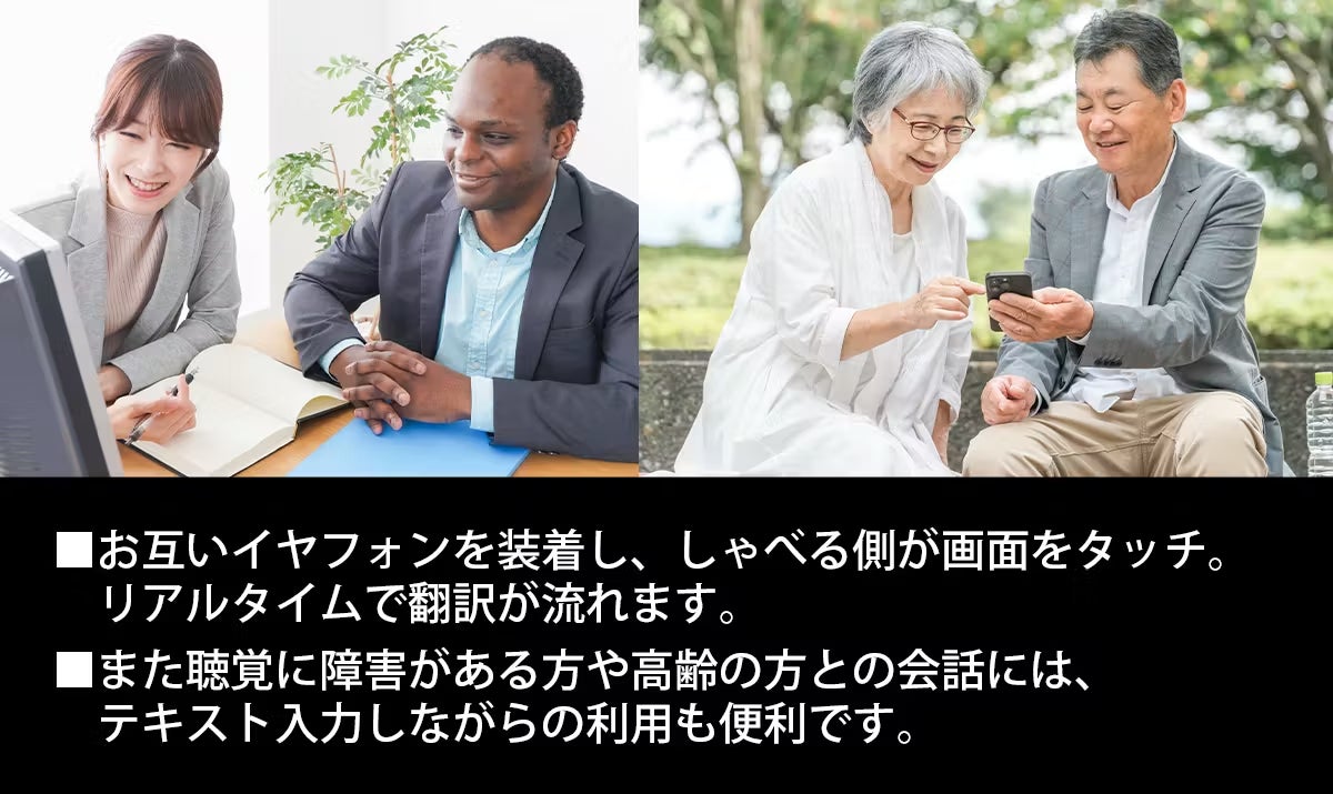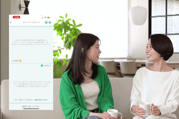 一方、より手軽でスピーディーなやり取りに最適なのが「タッチ翻訳モード」です。イヤホン装着は自分のみ。相手にはスマホに向かって話してもらいながら翻訳するスタイルで、画面やイヤホンをタップするだけで翻訳の開始・停止を瞬時に切り替えられます。自分の耳には日本語訳が流れ、相手側のスマホ画面には翻訳文章が表示されると同時に音声も再生されます。お店での注文や移動中の問いかけなど、ちょっとした瞬間にサッと使えるこの手軽さが、日常生活のあらゆる場面をストレスフリーに変えてくれます。
