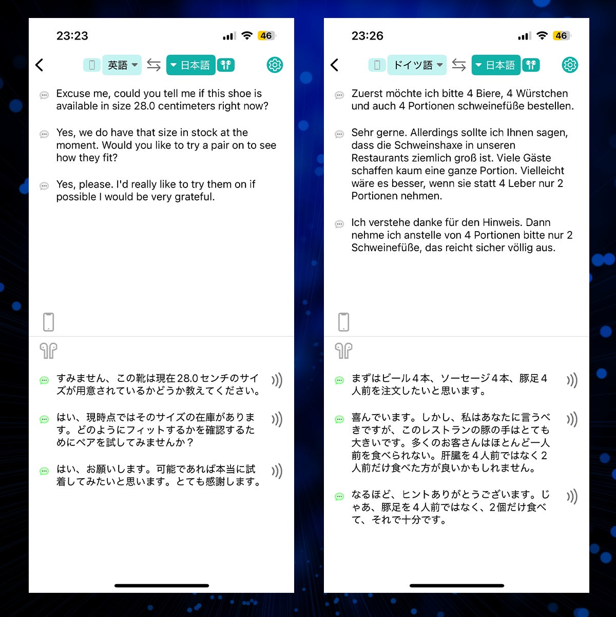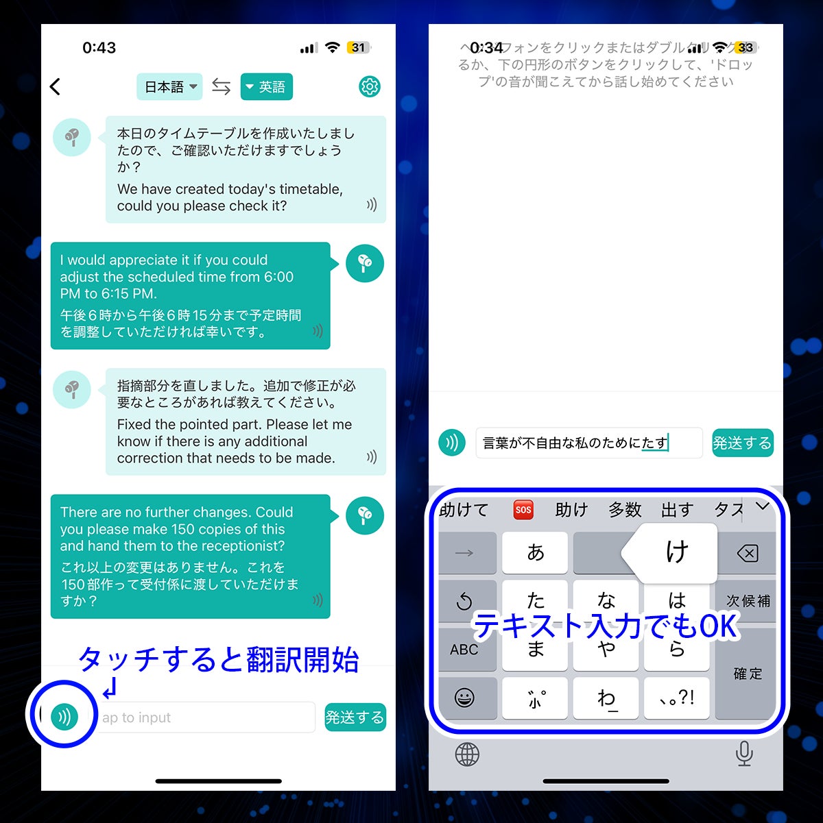 お互いがイヤホンを装着した状態で、話す側がスマートフォンの画面をタップすると、すぐに翻訳がスタートします。