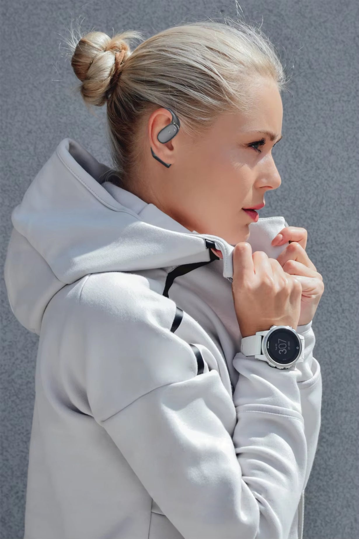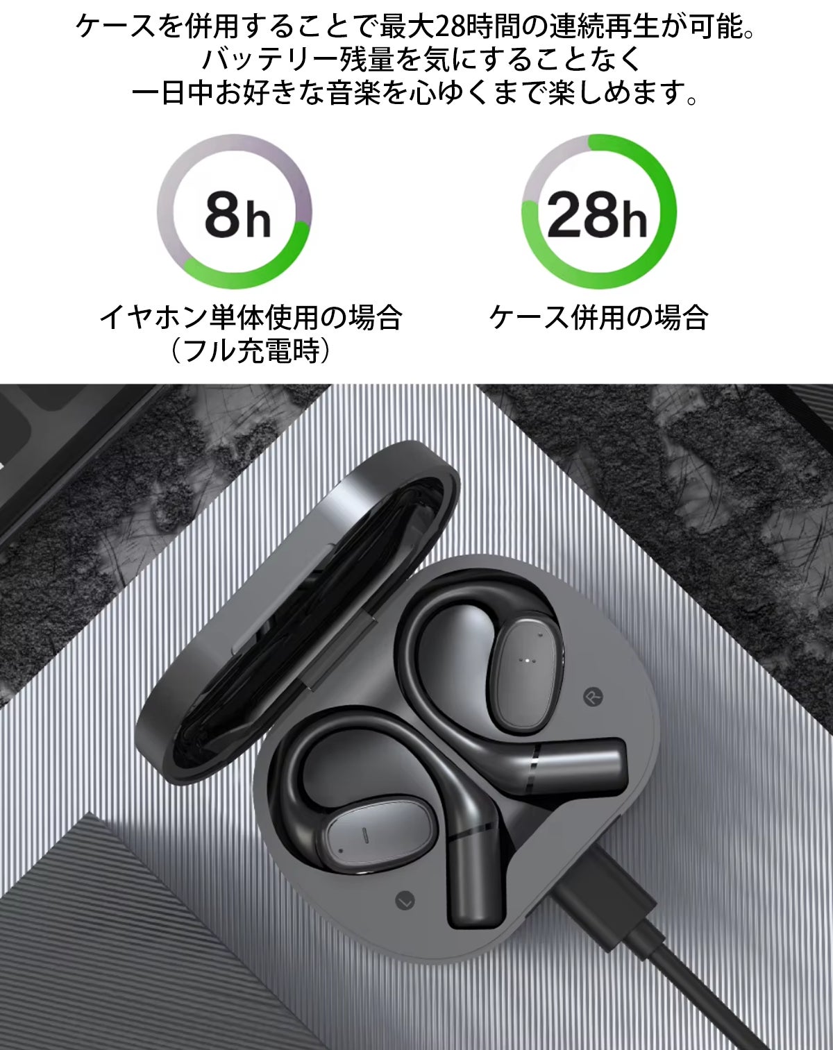耳をふさがないオープンイヤー型だから周囲の気配もちゃんと感じられて交通事故などのリスクも軽減!音楽も通話もこれひとつ!