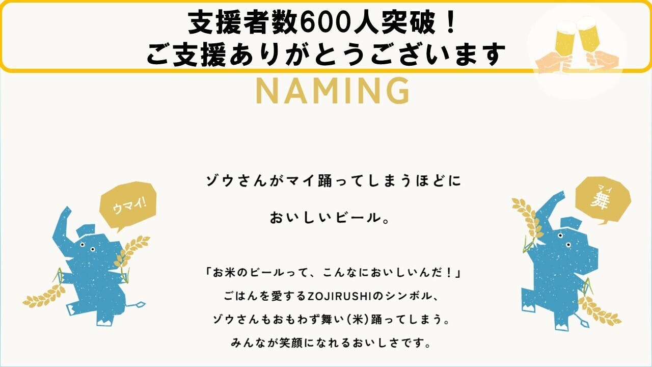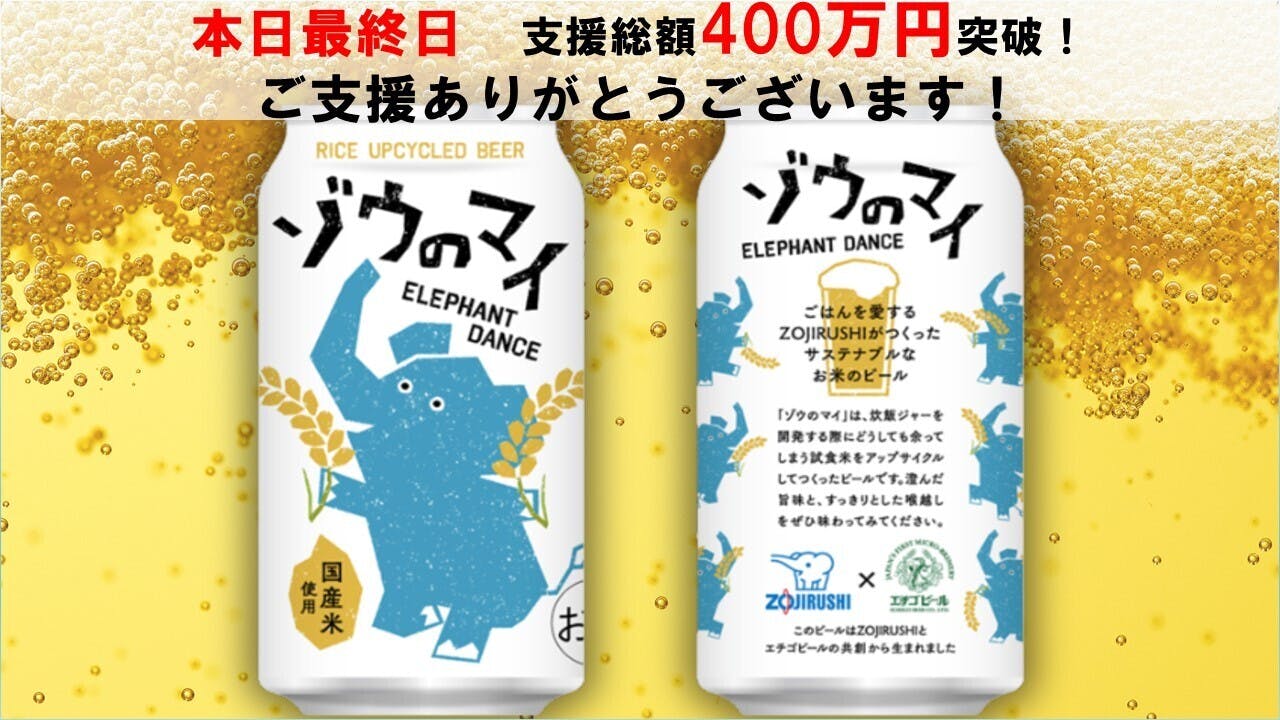 2026/03/05 12:00皆さま、プロジェクトへの温かいご支援をいただき誠にありがとうございます!いよいよ、本プロジェクトも本日が最終日となりました。昨日、ついに支援総額が400万円を突破いたしました! 当初の目標を遥かに超える、760名以上の皆さまから温かいご支援と激励のメッセージをいただき、スタッフ一同、驚きと共に胸が熱くなる思いです。本当にありがとうございます。★支援者の皆さまからの温かい声★届いたメッセージの一部をご紹介させていただきます。「お米の入ったビールは初めてなので楽しみです!」「ネーミングと象の絵にやられました。もちろん、ここまでに至った思いにも共感します。どんなビールになっているのか楽しみです。」「お米が勿体ないなので、素晴らしいと思います。初めてクラウドファンディングに参加します。応援しています!頑張ってください!」皆さまからのこうした一言一言が、私たちの大きな原動力となっています。「もったいない」を「おいしい」へ象印が本気で取り組んだアップサイクルビール「ゾウのマイ」が、これほどまでに多くの方に共感していただけたことは、私たちにとって大きな自信となりました。本日23:59まで、走り抜けます!募集終了まで、残り数時間となりました。 「ゾウのマイ」を皆さまにお届けできるよう、最終日の本日も全力で走り抜けます。まだご検討中の方がいらっしゃいましたら、ぜひこの「おいしい循環」の輪に加わっていただけると嬉しいです。 最後の瞬間まで、どうぞよろしくお願いいたします! もっと見る
