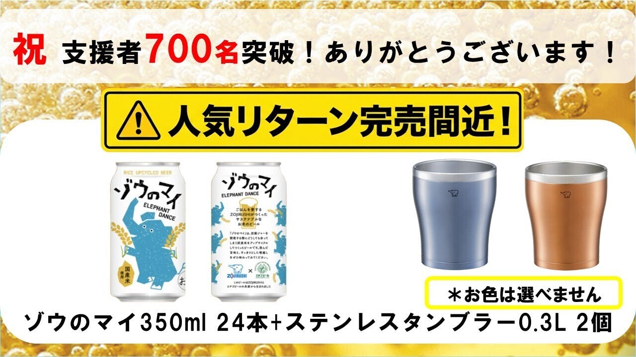2026/02/26 19:00皆さま、プロジェクトへの温かいご支援をいただき誠にありがとうございます!現在挑戦中のプロジェクト「ゾウのマイ」アップサイクルビールプロジェクトですが、ついに支援者数が600人を突破いたしました!多くの皆さまに共感いただき、温かいご支援と応援コメントをいただいておりますこと、チーム一同心より感謝申し上げます。本当にありがとうございます!■ プロジェクト終了まで、残り「7日」となりました先行予約販売としてお届けしているこのプロジェクトも、いよいよ残り1週間です。「ゾウさんがマイ踊ってしまうほどにおいしい」 そんな自信作のビール「ゾウのマイ」と、象印の技術が詰まった「ステンレスタンブラー、炊飯ジャー」がセットで手に入るのは今だけのチャンスです。■ まだ間に合います!おすすめのリターン特にタンブラーセットは、お届け後すぐに最高の状態でビールを楽しめるとご好評いただいております。【12本セット+タンブラー1個】:自分へのご褒美にぴったり!【24本セット+タンブラー2個】:ご家族やご友人と乾杯するならこちら!最後まで、一人でも多くの方にこの「おいしい循環」の輪に加わっていただけるよう、走り抜けてまいります。周りの方へのシェアや、SNSでの拡散も大きな力になります。 残り7日間、引き続き応援のほどよろしくお願いいたします! もっと見る