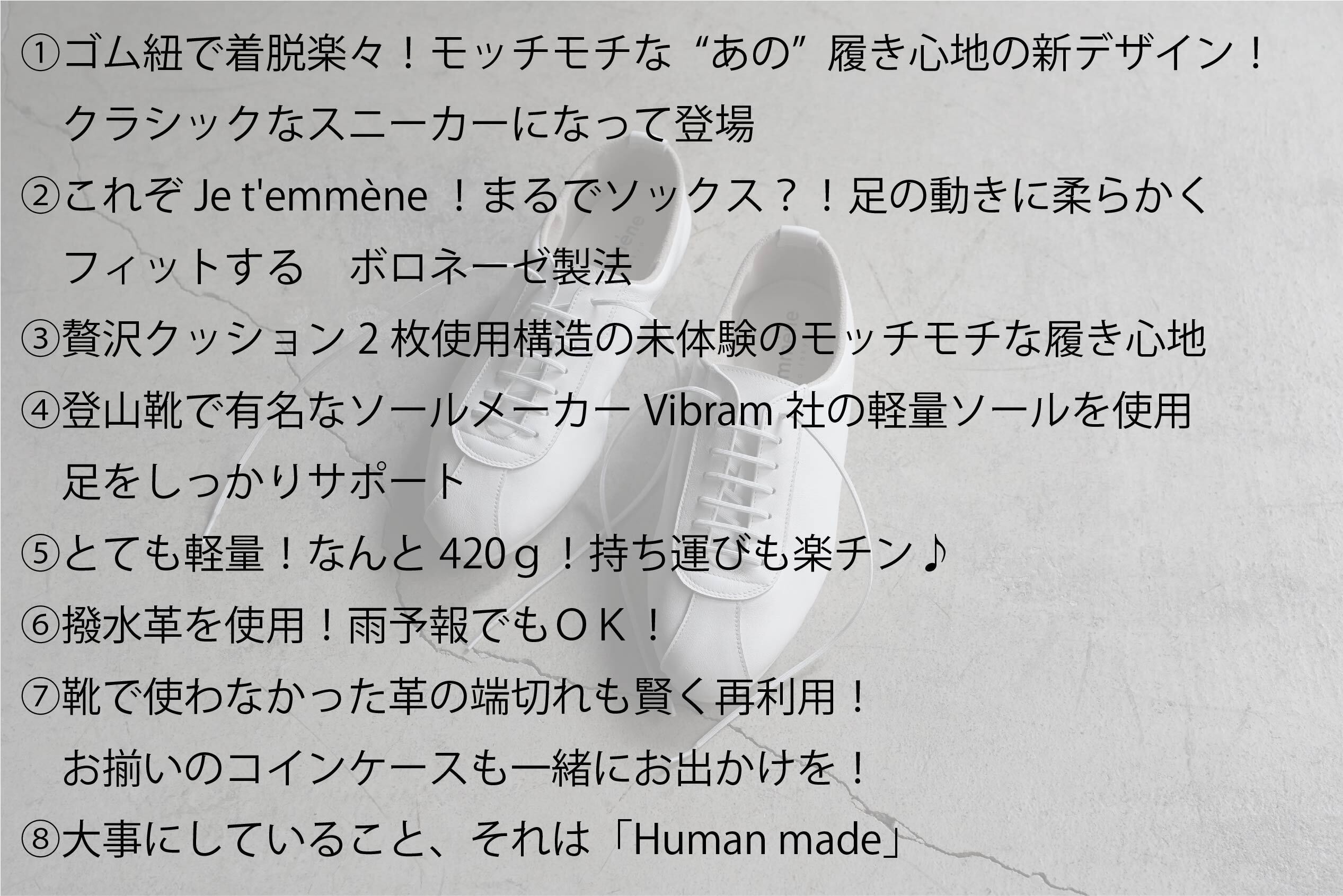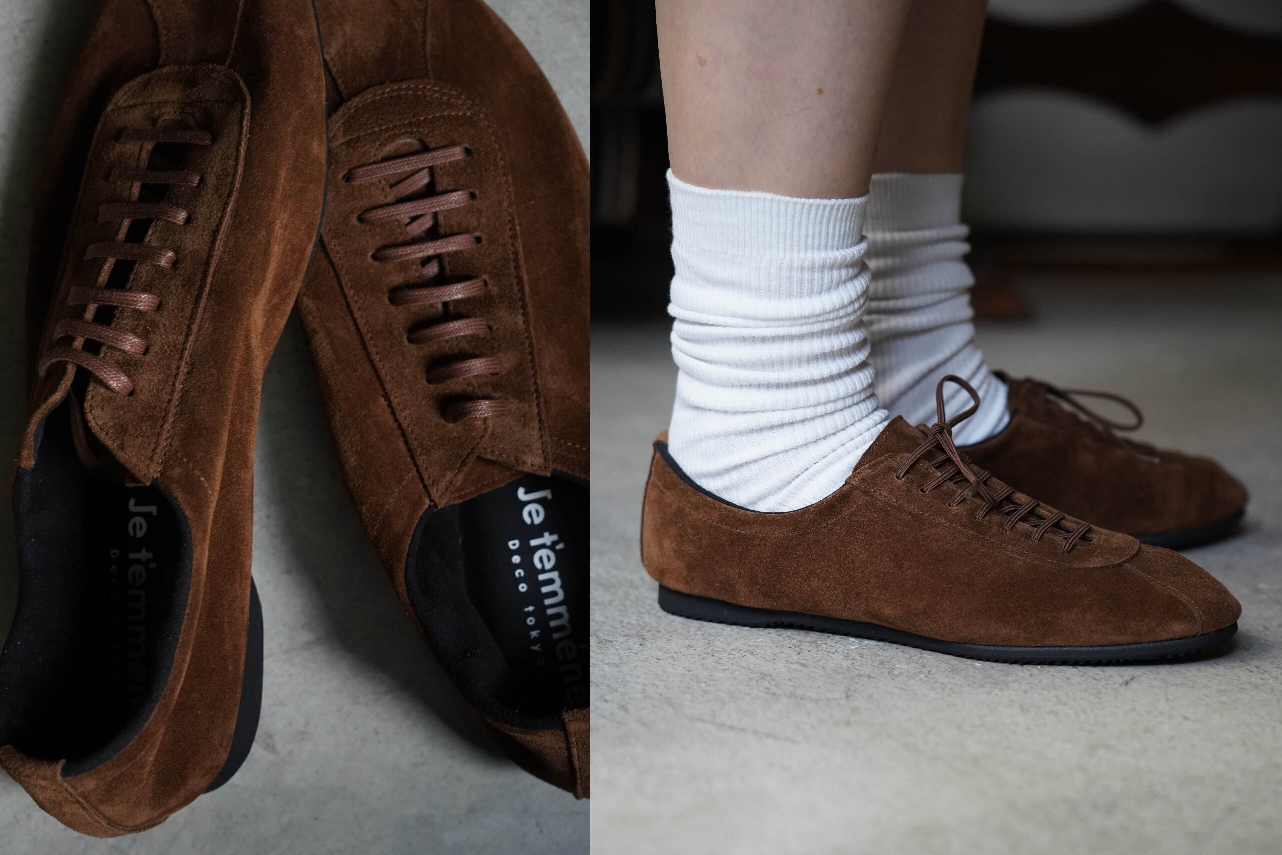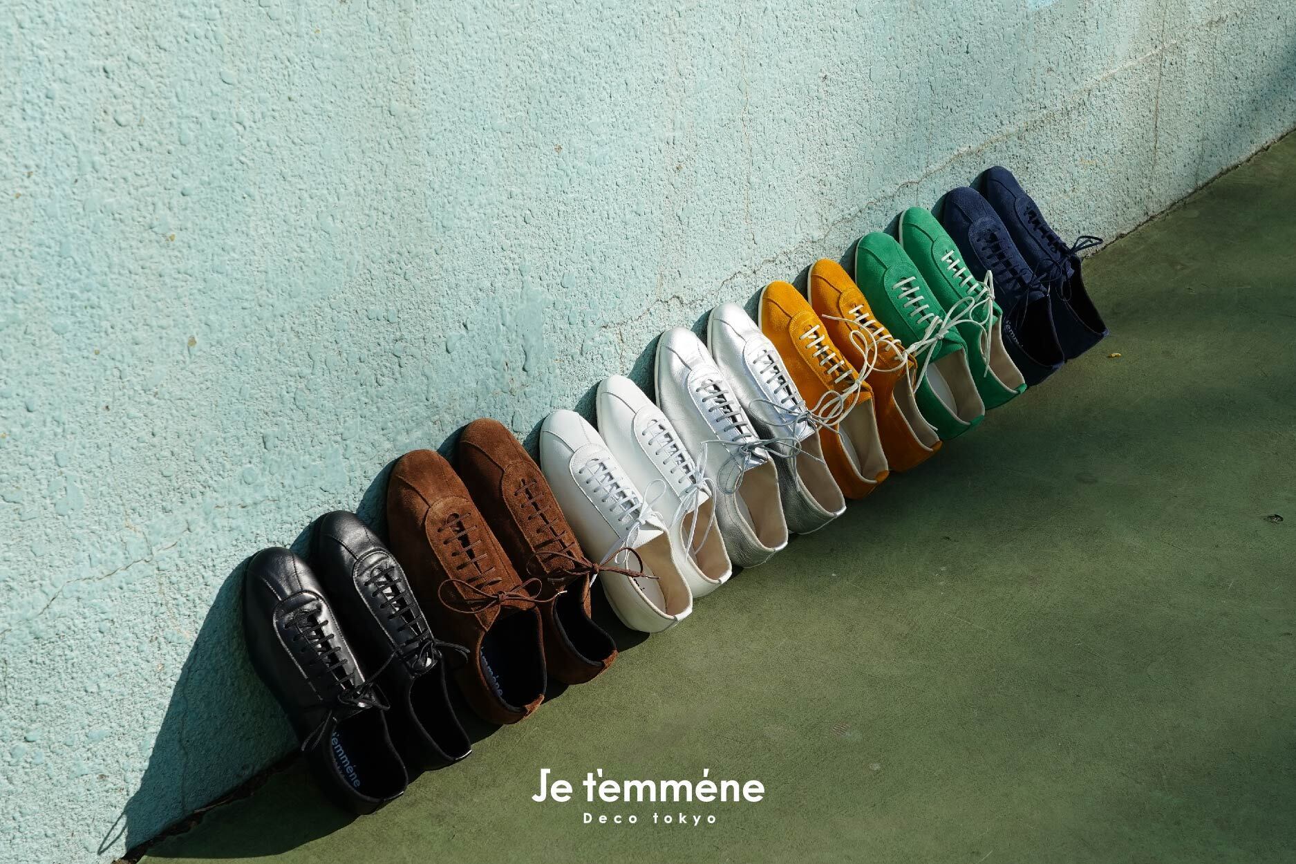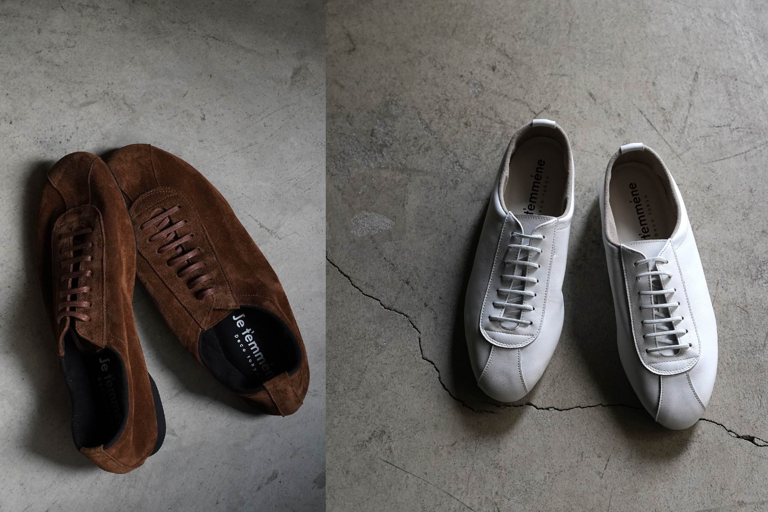 Je t'emmène(ジュトメンヌ)は長く愛されてきた歴史ある普遍的な JAZZシューズを原型に、ベーシックでありながらまるでソックスのような包み込まれる楽ちん感、また撥水革を使用し天候に左右されず、更には性別も問わず履けるジェンダーレスシューズです