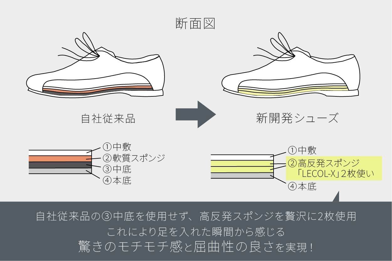 更に従来のクッション構造をより進化させクッション性の高い新素材高反発スポンジ「LECOL-X」を中敷きと靴底の間に贅沢に2枚使用