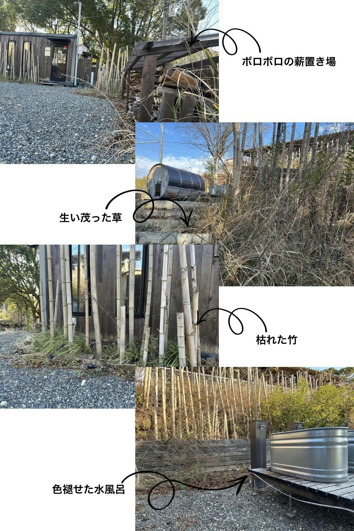 本来、心身を整えるための空間に「生い茂った枯れ草」や「色褪せた竹」が放置されており、リラックスするための清潔感が保てていません。