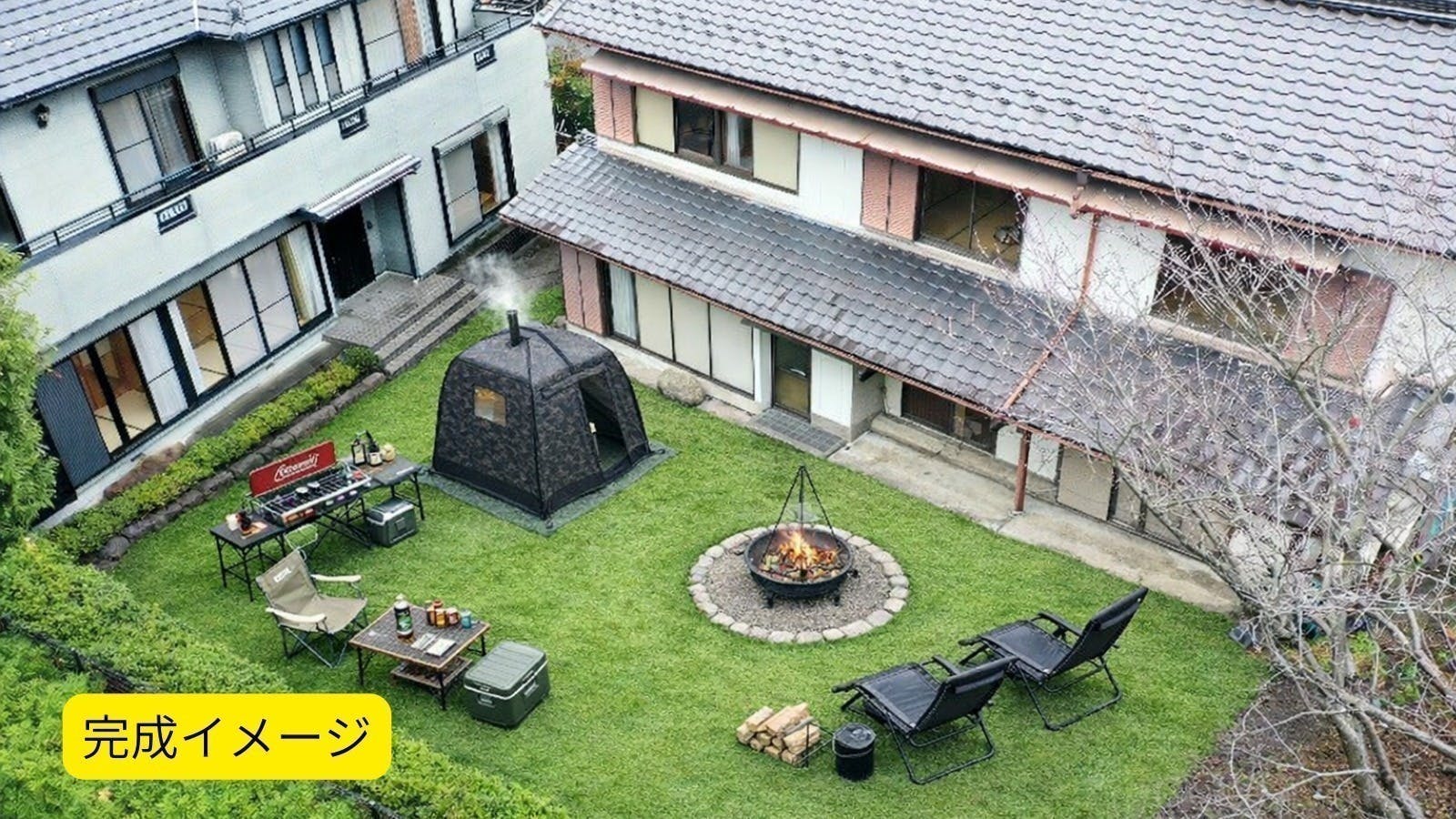 一棟貸切の宿をいち早く体験できるリターンとして、内装のDIY体験、リフォーム完成時の見学会とテントサウナ体験を用意しております。