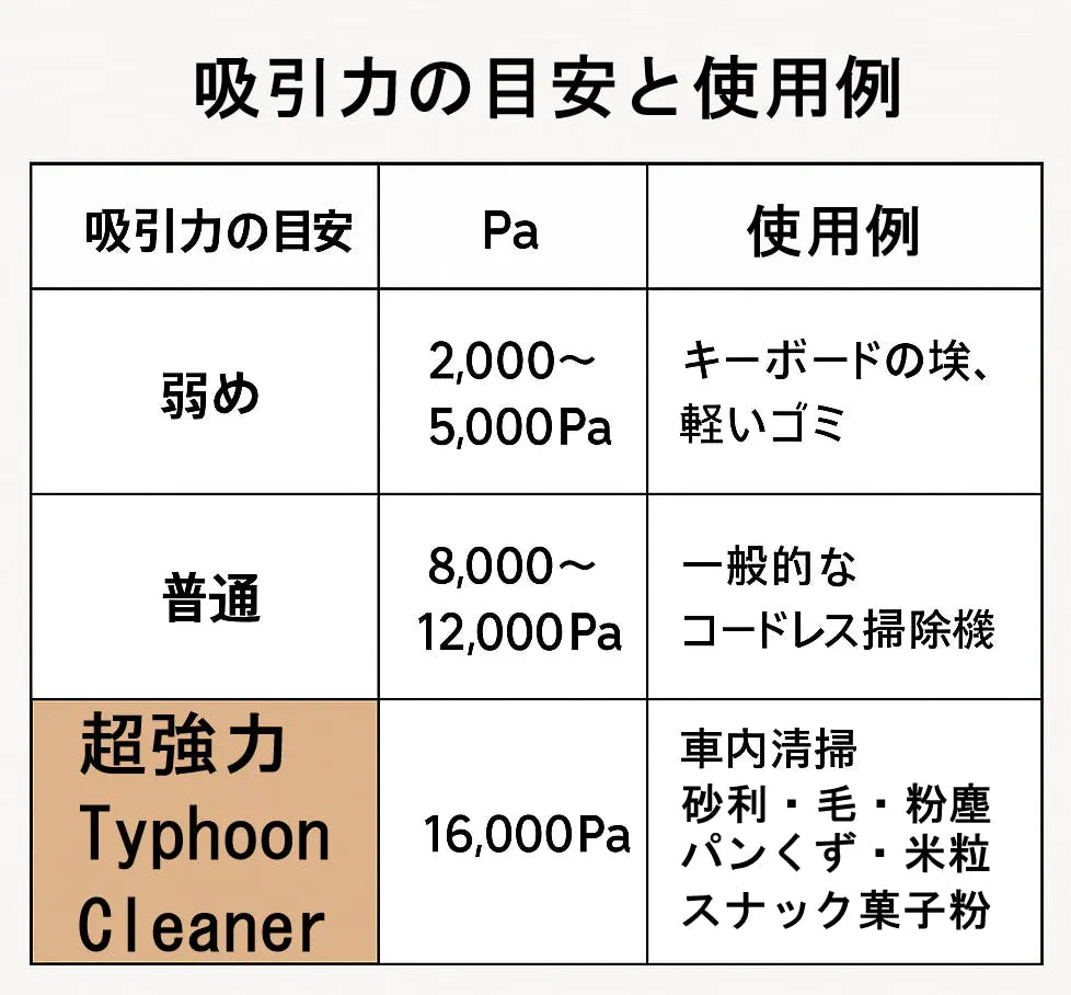 Typhoon Cleanerの吸引力 は超強力な16,000Pa(パスカル)