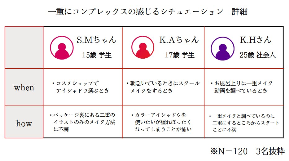 「いつ」「どのように」でさらに掘っていくと、、、メイクやコスメと関わるときの違和感や不安、不満を抱えている具体的な声を、多く頂きました。