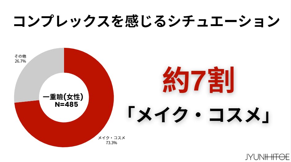 すると、なんと約7割が「メイク・コスメ」が占めているということがわかりました。メイクやコスメは社会ではマナーの一つ。毎日当たり前のようにすることがコンプレックスシチュエーションになっていました。