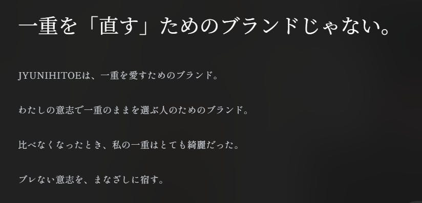 加えて、一重瞼について熱く語ってきましたが、私は一切「二重の方」「二重にすること」を否定したい訳ではありません。「一重のまま」という選択肢が表になっていない今、「一重のまま」という選択肢を世の中に届ける存在になりたい そんな思いから生まれたブランドです。