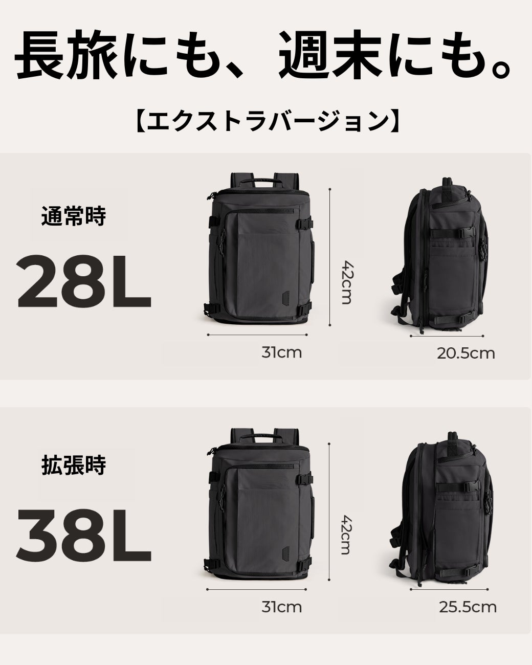 エクストラは普段28Lとして使え、必要なときだけジップを開けて38Lに拡張できるため、「迷ったらエクストラ」という選び方もおすすめです。