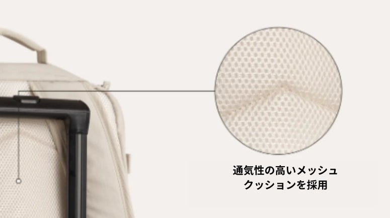 背面は通気性のあるメッシュクッションを採用。長時間の使用でもムレなく快適で、背負心地も抜群です。