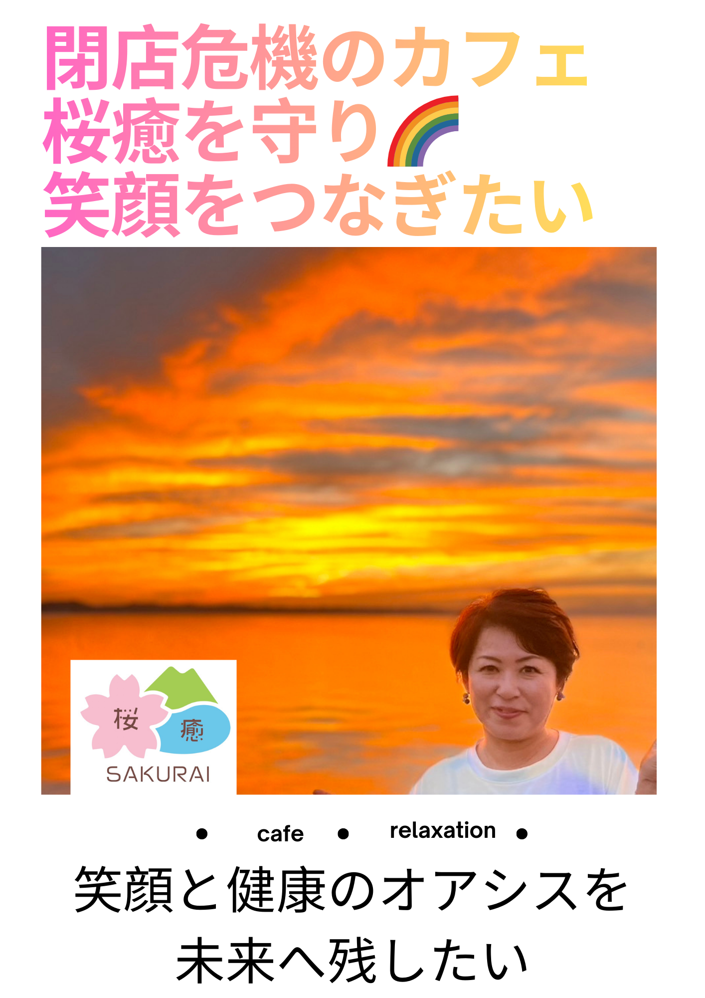 はじめまして、行方市でカフェ&リラクゼーション【桜癒】を運営しております櫻井麻由美と申します。2020年にオープンした私のお店は、コロナ禍の影響で経営に行き詰まり、来年閉店を考えていました。しかし、常連のお客様から存続を願う声をたくさんいただき、地域活性化のためにも、みなさんの笑顔と健康を維持していくコミュニティカフェを続けていきたいと強く思うようになりました。