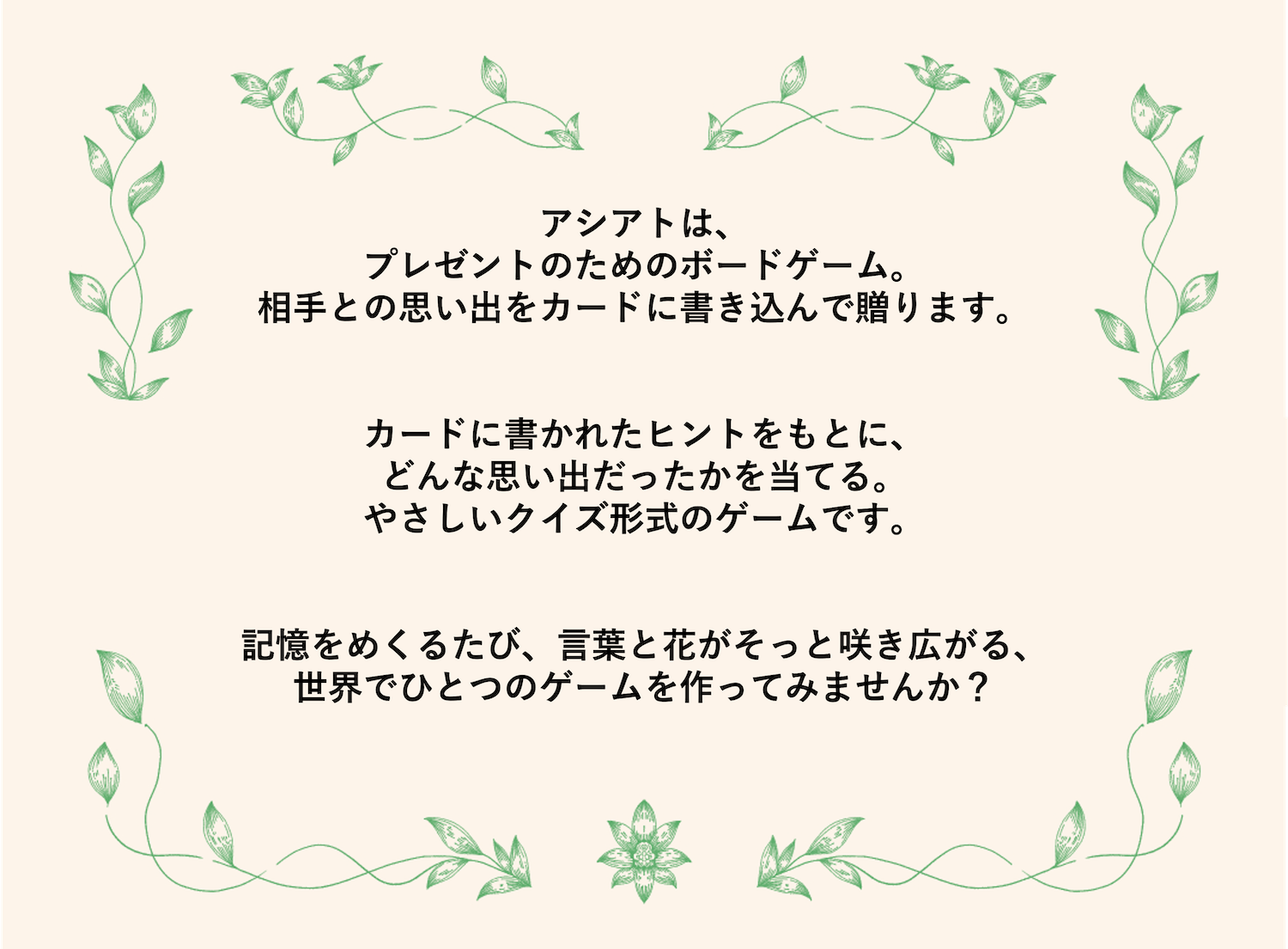 アシアトは、「遊べるギフト」というボードゲームの新しい可能性を、一緒に広げていくためのプロジェクトです。