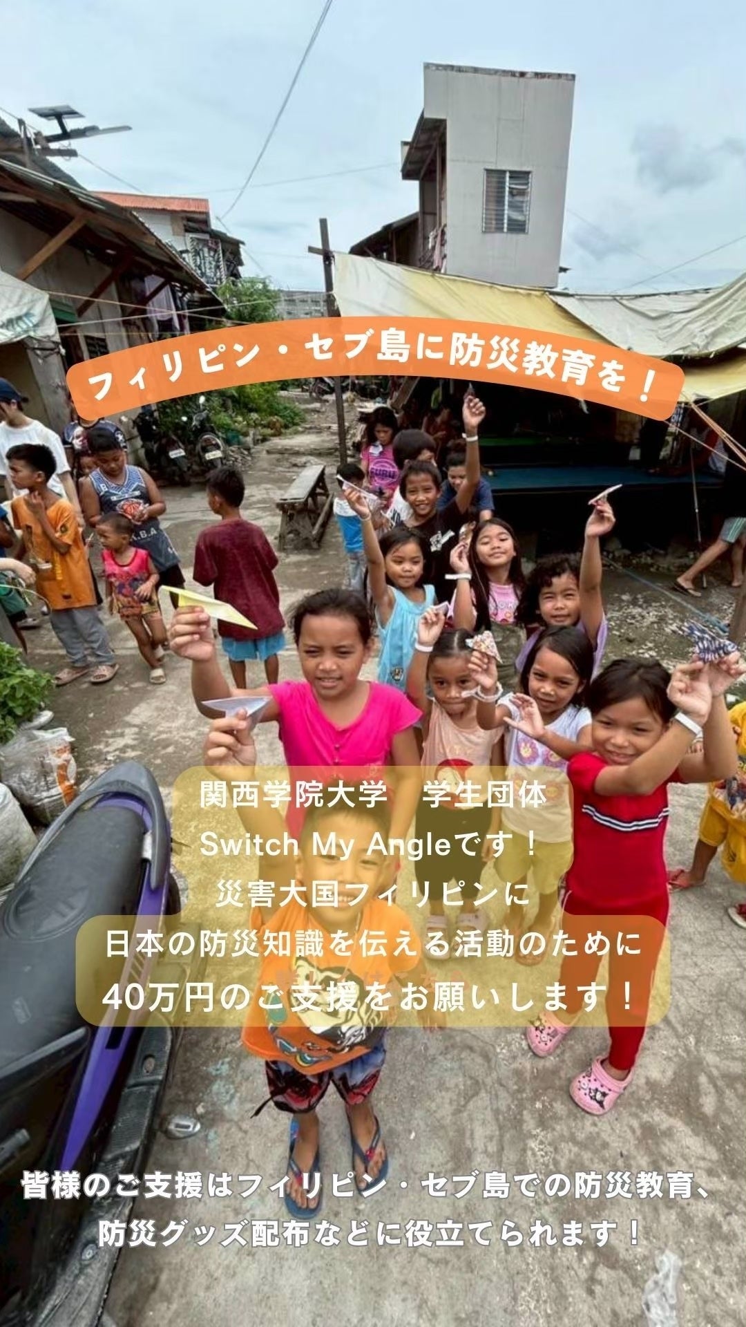 初めまして!こんにちは!関西学院大学学生団体Switch My Angleです!私たちはセブ島の子供たちに日本の防災知識を伝えるために、3月に支援活動を行います!その資金として、40万円をクラウドファンディングで集めたいと考えています!この活動報告投稿では、支援活動に向けての準備や、渡航中の様子などを随時更新していきます!みなさまのご支援をお待ちしております!
