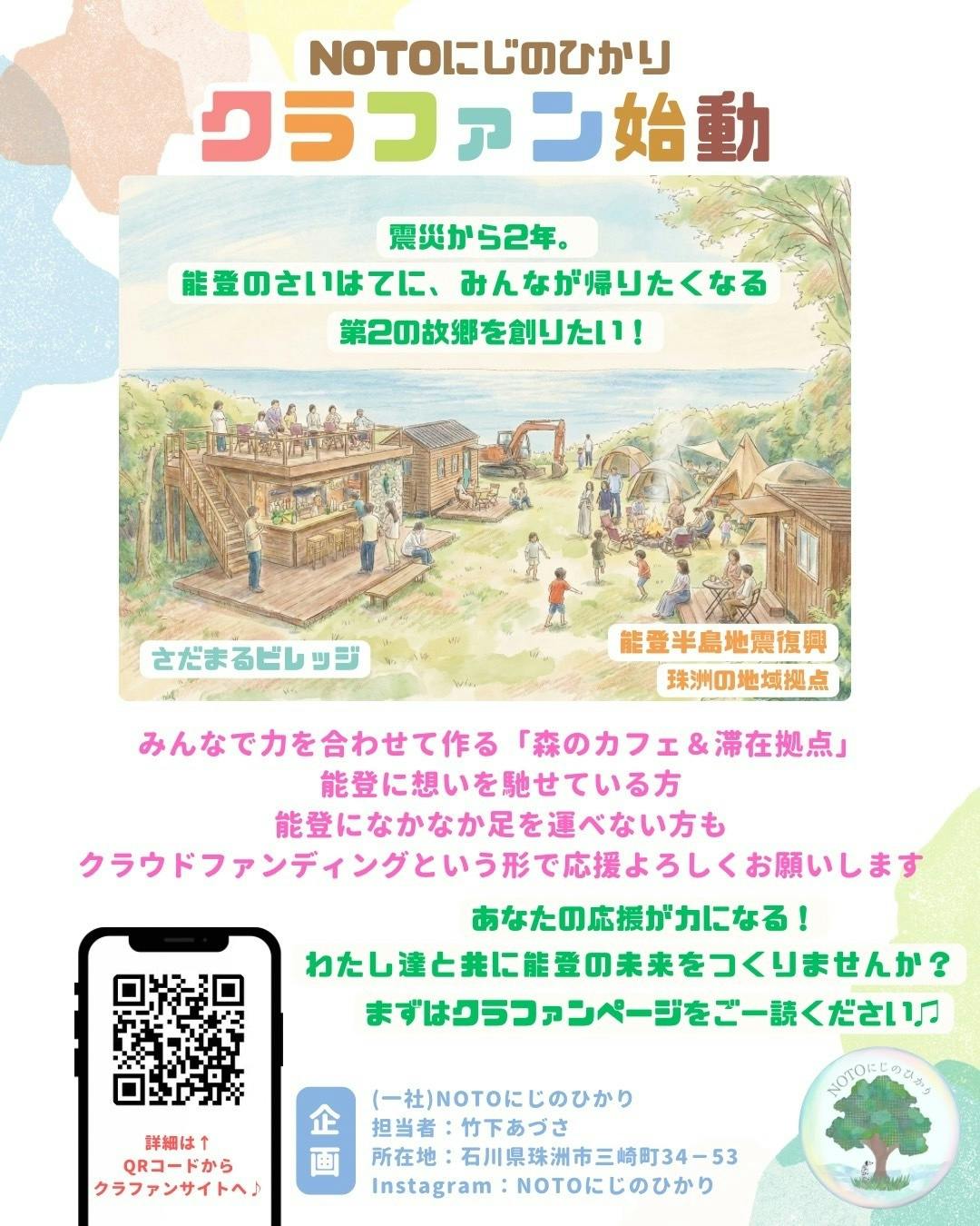 2025/12/30 16:09ついに本日12月30日よりクラウドファンディング公開!震災からまもなく2年…まずはここまで支えてきてくださった多くのみなさまに感謝申し上げます!今の能登はまだまだ「復興」とは言えず、仮設住宅から次の住処までにはまだ数年かかり、住民には「先行きの見えない部分」もありますが、同時に「未来の希望を生み出す」ということも、とても大事な時期に来ているように思います。わたしたちは能登に住む若者として、「10年後・20年後も住み続けられる未来」大好きな「能登での暮らし」のために一歩を踏み出します。震災前はとんでもない藪だった広大な山林を、震災後に「こどもが遊ぶ場所がほしい」という声を聴き、この一年半ほど開拓を進めてきました。今後も自分たちの手で開拓・整地をし、職人さんとみんなで力を合わせて小屋もつくり、時間をかけて場を育てていく予定です。その活動すらも 人生において、かけがえのない経験になることでしょう♡現地で汗を流すことももちろん大事ですが、能登というアクセスの都合上、なかなか来れない方も多いのも事実…そんな方々にもクラファンに参加することで、「能登の未来を共につくる活動」に参加して頂きたいです!尚 今回のクラファンは復興の助成もあり、より能登に直接的に届きやすいものとなっているという点も 添えておきます。そして 今回の挑戦の中で、「能登の未来を共につくっていく」という想いの仲間が増えていけば うれしいです♡来年はオンラインの会なども増やして、離れている方々とも「共に」の部分も増やす予定なので、ぜひその辺りも含めて 仲間になって頂ければ幸いです!このようなチャレンジの機会を頂き、みなさまのあたたかい応援に感謝申し上げます!”支援するよ!”と言ってくださった方”応援しようかな”と思ってくださってる方1月1日に能登が世間から注目される時に、多くの方に応援してもらえるよう、ひと足先のご支援のご協力・お力添えをお願いします!SNSでのシェアも大変ありがたいです!それぞれのできる形で「共に」を作れたらうれしく思います。年末のお忙しい中、応援ありがとうございます!(一社)NOTOにじのひかりさだまるビレッジ 代表 竹下あづさ もっと見る